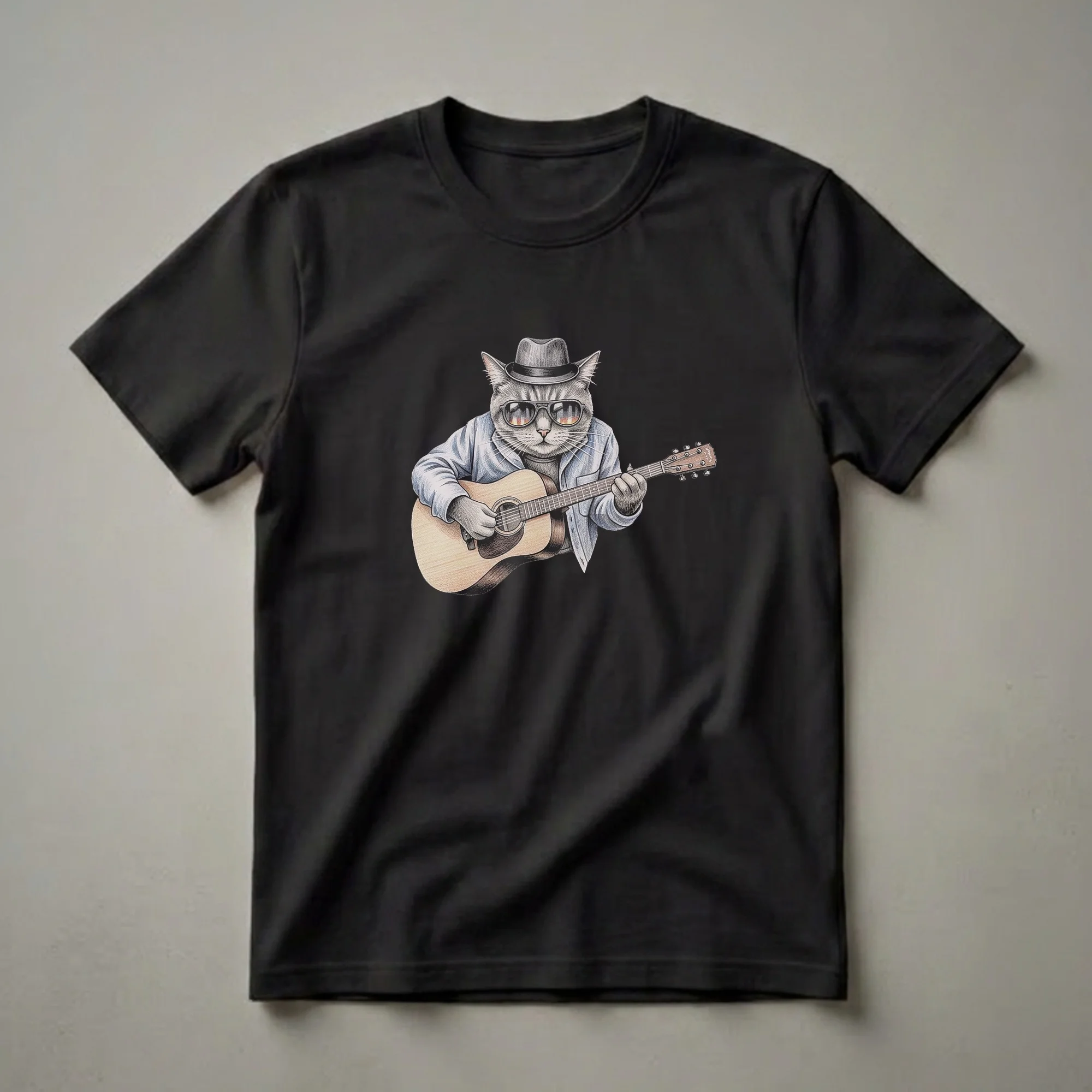 - A cool cat playing an acoustic guitar graphic tee for musicians.