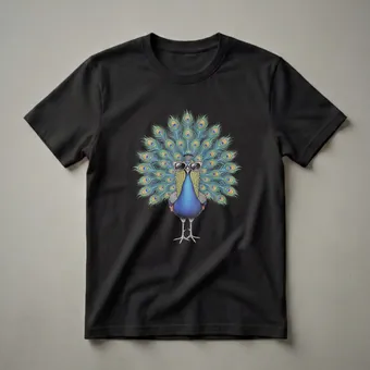 Peacocks, known for their striking iridescent plumage and the male's elaborate train of feathers, are a symbol of beauty and grace. This eye-catching graphic tee features a detailed, vintage-style drawing of a peacock sporting cool sunglasses. The bird's magnificent tail feathers are fanned out in a vibrant display of blues, greens, and golds, each eye-spot rendered with intricate detail. The peacock itself is depicted with a rich blue body and a textured yellow neck, standing proudly on its slender legs. This t-shirt is a fantastic way for bird lovers, wildlife enthusiasts, or anyone who appreciates unique art to express their personality. It makes a thoughtful gift for someone who adores birds or enjoys a touch of quirky style. Wear this shirt to casual outings, nature walks, or simply when you want to add a conversation-starting piece to your wardrobe. The detailed illustration captures the regal yet cool demeanor of this magnificent bird, making it a standout addition to any collection of nature-themed apparel.