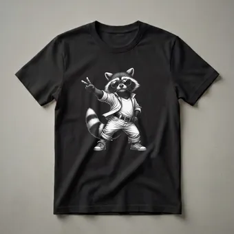 Raccoons, known for their masked faces and dexterous paws, are often seen as mischievous urban dwellers, foraging for food in a variety of environments. This striking graphic tee captures a different side of the raccoon, portraying it as a cool, dancing character ready to party. The black and white illustration features a raccoon sporting stylish sunglasses, a casual button-down shirt unbuttoned over a t-shirt, and a pair of jeans with a belt. It strikes a confident pose, holding up two fingers in a peace sign, exuding a playful and energetic vibe. This shirt is a fantastic choice for anyone who appreciates a good laugh and unique animal humor. It makes a thoughtful gift for friends or family members who have a quirky sense of style or a fondness for these clever creatures. Whether you're heading to a casual get-together, a game night, or just want to add some personality to your everyday wear, this raccoon tee is sure to turn heads and spark conversations. It’s a go-to tee for those who don't take themselves too seriously and enjoy expressing their fun-loving spirit through their clothing. Embrace the playful spirit of this dancing raccoon and let your personality shine.