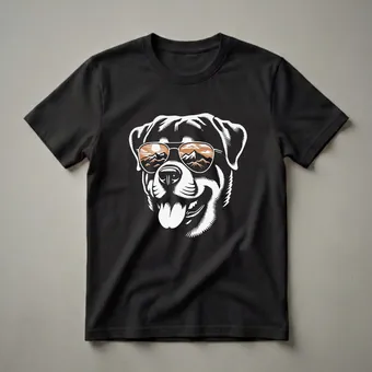 Rottweiler owners who appreciate bold, striking designs will reach for this unique graphic tee. The artwork features a stylized Rottweiler head, rendered in sharp black and white lines, sporting classic aviator sunglasses. The lenses of these shades reflect a vibrant mountain landscape at sunset, complete with jagged peaks and a warm, glowing sun. This eye-catching design captures the cool, adventurous spirit that many associate with the breed. Rottweilers, known for their strength and loyalty, are often seen as confident companions, and this shirt embodies that persona. This tee works well for anyone who loves dogs, especially those with a soft spot for the Rottweiler breed. It makes a thoughtful gift for a birthday or any occasion for the Rottie mom or dad in your life. Wear this shirt to casual outings, dog park visits, or while enjoying the great outdoors, reflecting a shared passion for both canine companionship and scenic vistas. It's a staple in the collection for dog lovers.