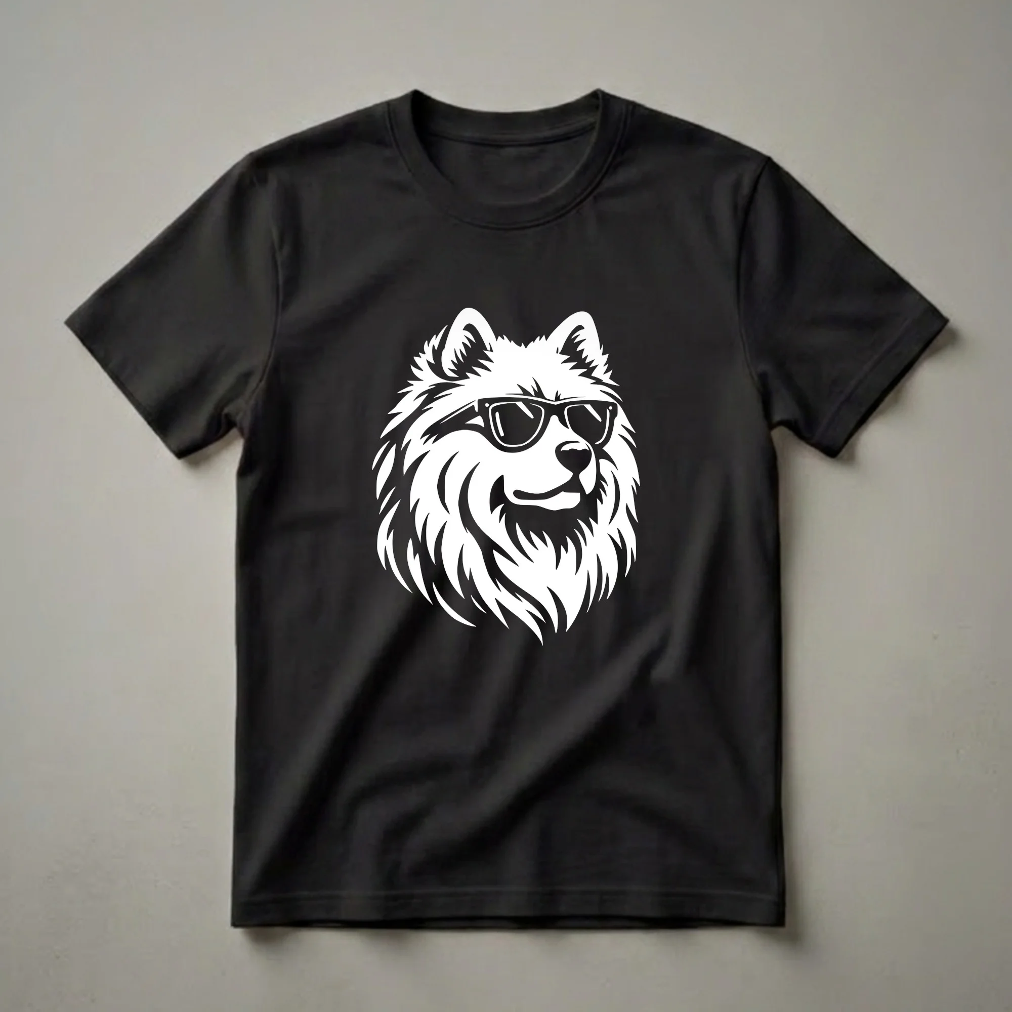 Samoyed owners know the breed's distinctive smile and fluffy white coat, often referred to as a 'Sammy smile.' This striking graphic tee captures that playful spirit with a stylized white Samoyed head sporting classic black sunglasses. The bold, high-contrast design stands out, making it a go-to tee for anyone who adores these intelligent and friendly dogs. Samoyeds, originating from Siberia, were bred as working dogs, known for their endurance and gentle nature. This shirt is a thoughtful gift for the dog mom or dog dad who cherishes their furry companion. It's a fantastic way to express your passion for your Samoyed, whether you're heading to a dog park, a casual outing, or just relaxing at home. The graphic tee offers a comfortable and stylish way to celebrate the unique bond between humans and their canine friends, embodying the cool, laid-back vibe of a dog ready for a sunny day. This shirt is a staple in the collection.