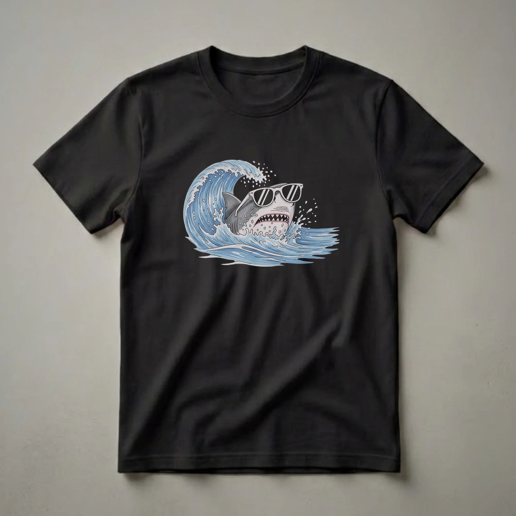 Ocean lovers and marine life enthusiasts will appreciate this striking graphic tee featuring a cool shark making a splash. The artwork depicts a stylized shark, complete with white-rimmed sunglasses, emerging from a dynamic blue wave. This design captures the playful yet powerful nature of sharks, often found in coastal waters and open oceans worldwide. Sharks, as apex predators, play a crucial role in maintaining the health of marine ecosystems. This t-shirt is a thoughtful gift for anyone who admires these fascinating creatures or enjoys surfing and beach culture. It's a go-to tee for casual outings, beach trips, or simply lounging at home. The vintage-inspired drawing style adds a unique artistic flair, making this shirt a standout piece for your wardrobe. Wear it to express your passion for the ocean and its inhabitants, or gift it to a friend who shares your enthusiasm for marine biology and surf art. This shirt is a conversation starter for anyone who loves the sea.