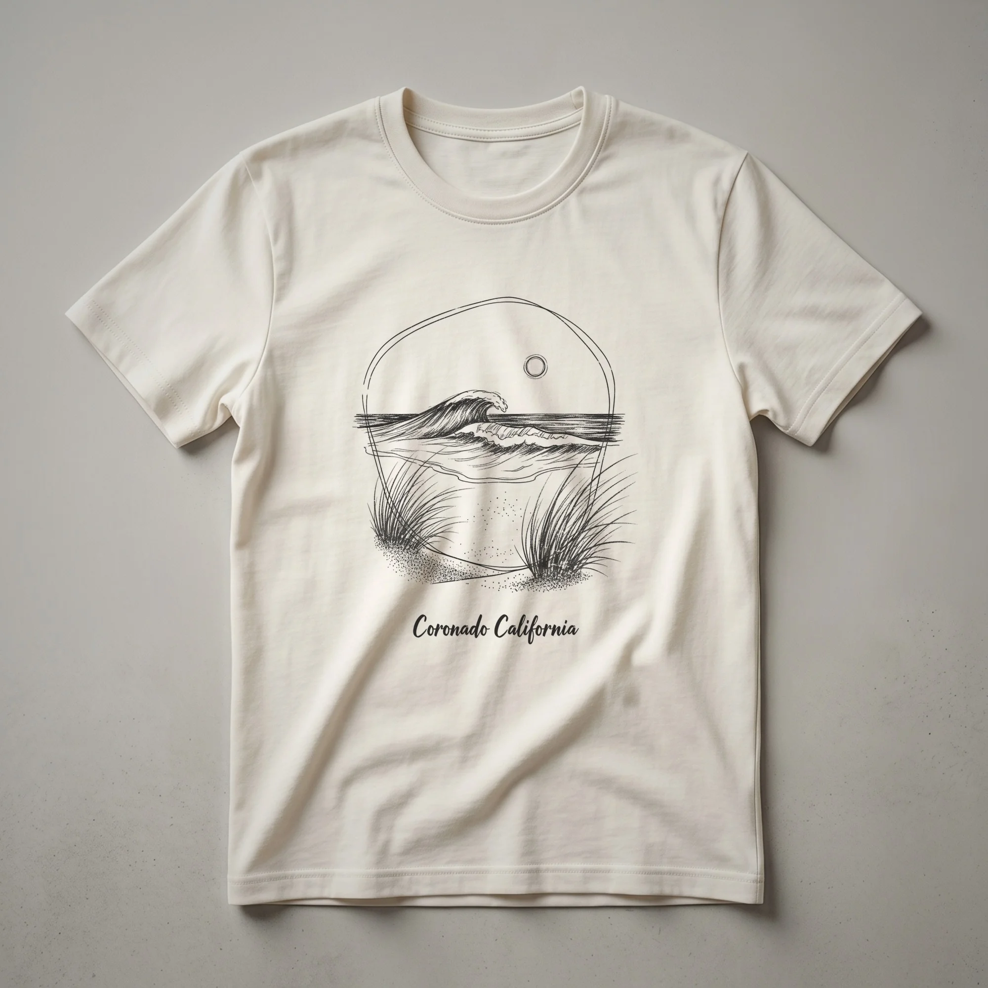 Coronado, California, a picturesque island city just across the bay from San Diego, is celebrated for its stunning coastline and the iconic Hotel del Coronado. This graphic tee captures the serene beauty of its shores with a striking line art sketch. The design features a powerful wave cresting under a full moon, with wisps of beach grass framing the scene. The text 'Coronado California' is elegantly scripted below, making it a wearable memento for anyone who cherishes this coastal gem. This t-shirt is a perfect way for residents and visitors alike to express their connection to this beloved Southern California destination. It works well for those who appreciate minimalist art and the calming presence of the ocean. Imagine wearing this shirt while strolling along Coronado Beach, feeling the ocean breeze and remembering your travels. It makes a thoughtful gift for friends and family who have a special place in their heart for Coronado or who dream of visiting its sandy shores. This apparel is a staple for anyone looking to showcase their California pride or their love for coastal landscapes.