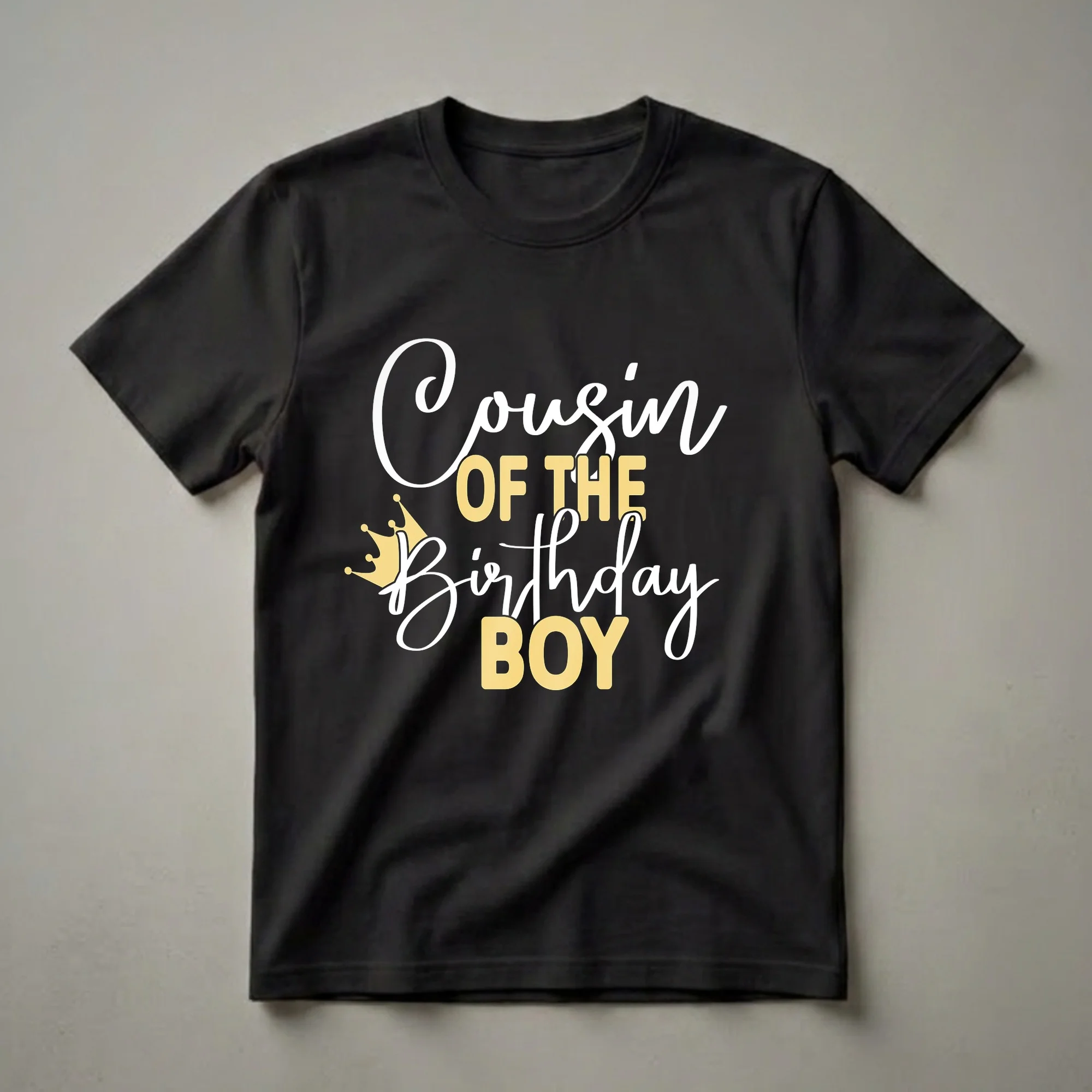 - Add a festive touch to birthday celebrations with this 'Cousin of the Birthday Boy' t-shirt, adorned with a golden crown.