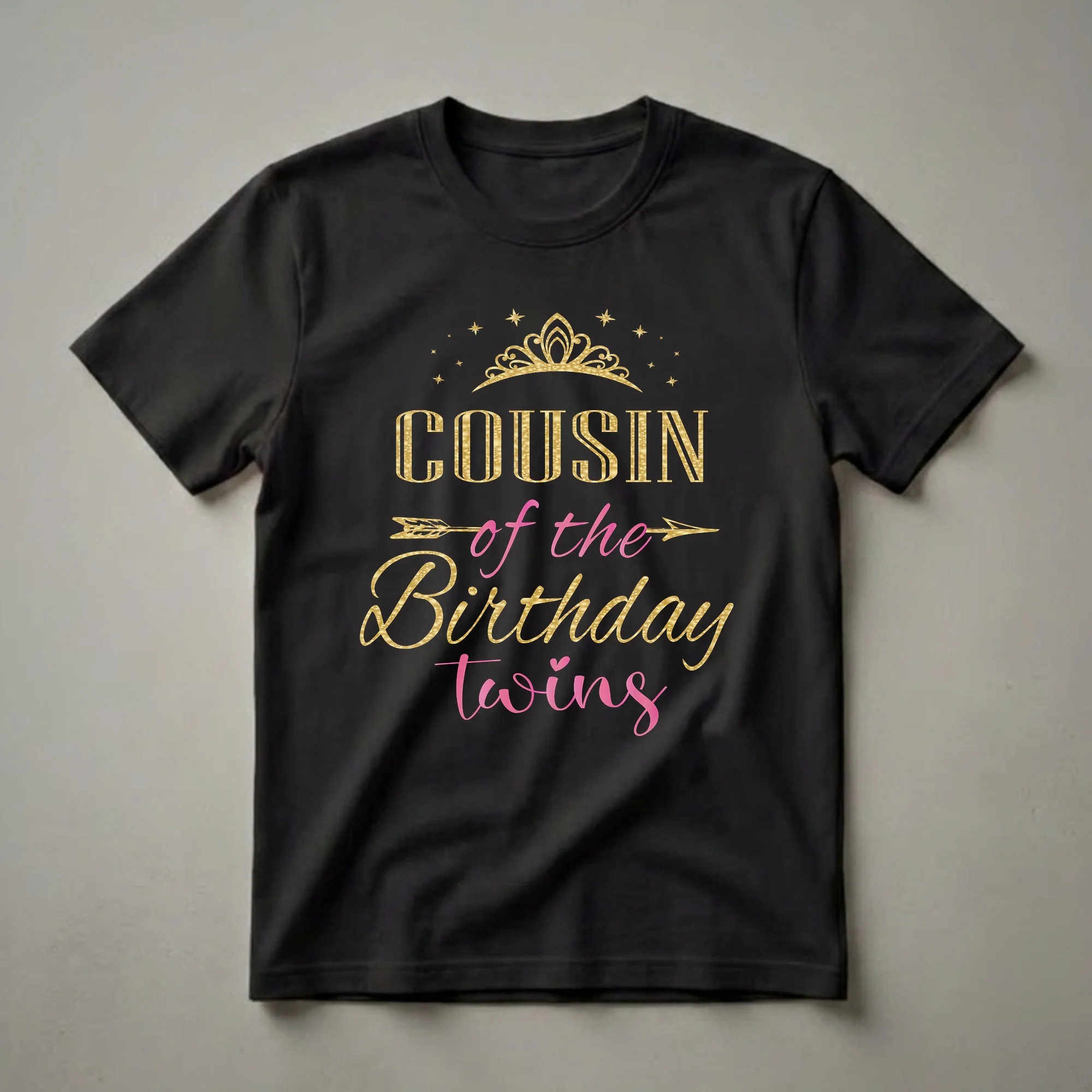 The cousin of birthday twins can celebrate in style with this eye-catching graphic tee. The design features a glittering golden crown adorned with stars at the top, setting a festive and regal tone. Below the crown, the word "COUSIN" is presented in bold, shimmering gold capital letters, immediately identifying the wearer's special role. Connecting "COUSIN" to the rest of the phrase is a delicate pink arrow, symbolizing direction and connection. The words "of the" appear in a smaller, elegant pink script, adding a touch of charm. Finally, "Birthday twins" is written in a playful, flowing script, with "Birthday" in gold and "twins" in a vibrant pink, accented by a small pink heart above the 'i'. This t-shirt is a thoughtful gift for any child who is a cousin to birthday twins, making them feel included and celebrated at the party. It's a fantastic way for them to show their family connection during the birthday festivities, whether it's a casual gathering or a more formal celebration. This shirt is a go-to tee for any young cousin looking to join in the birthday fun.