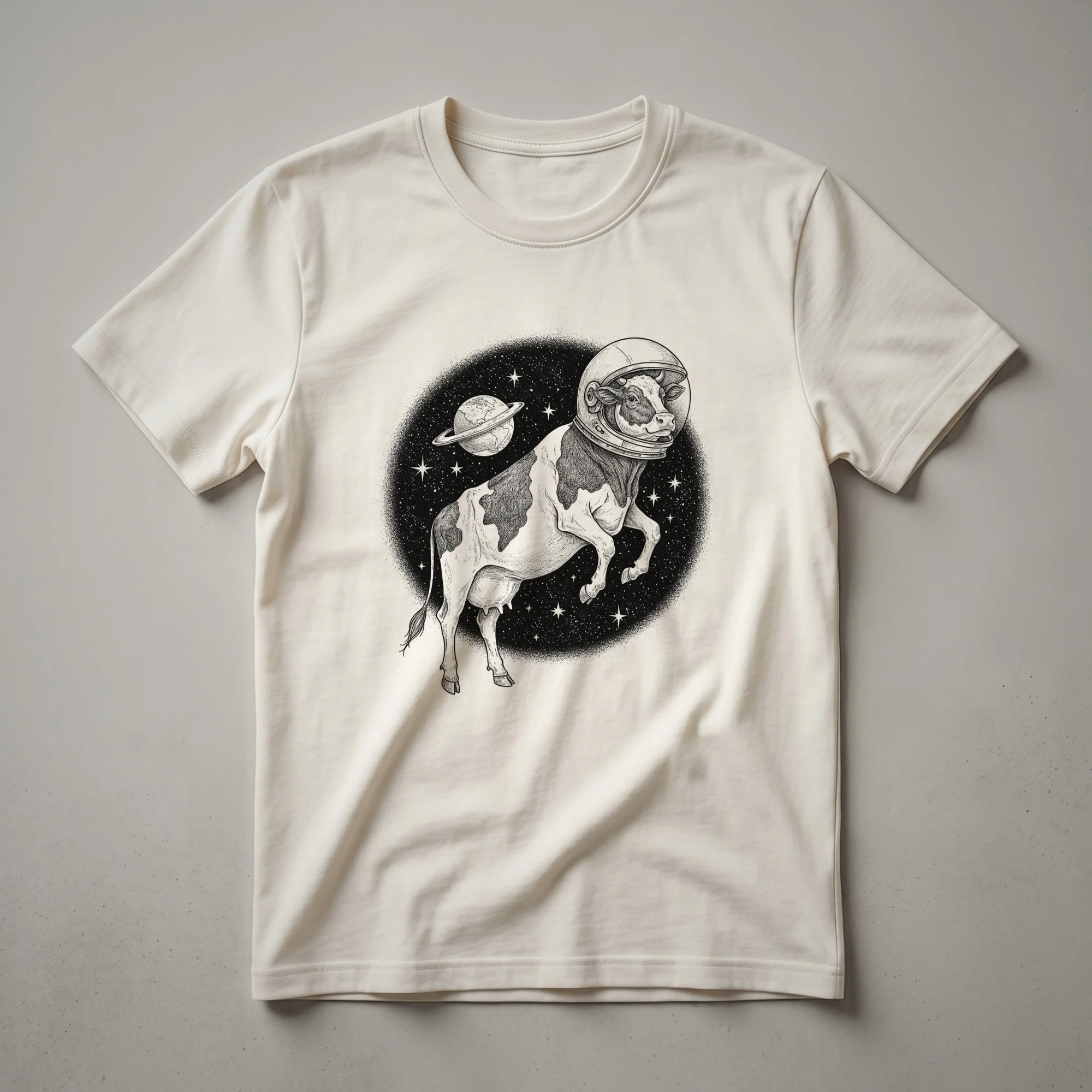 - This graphic tee showcases a cow astronaut exploring the vastness of outer space.