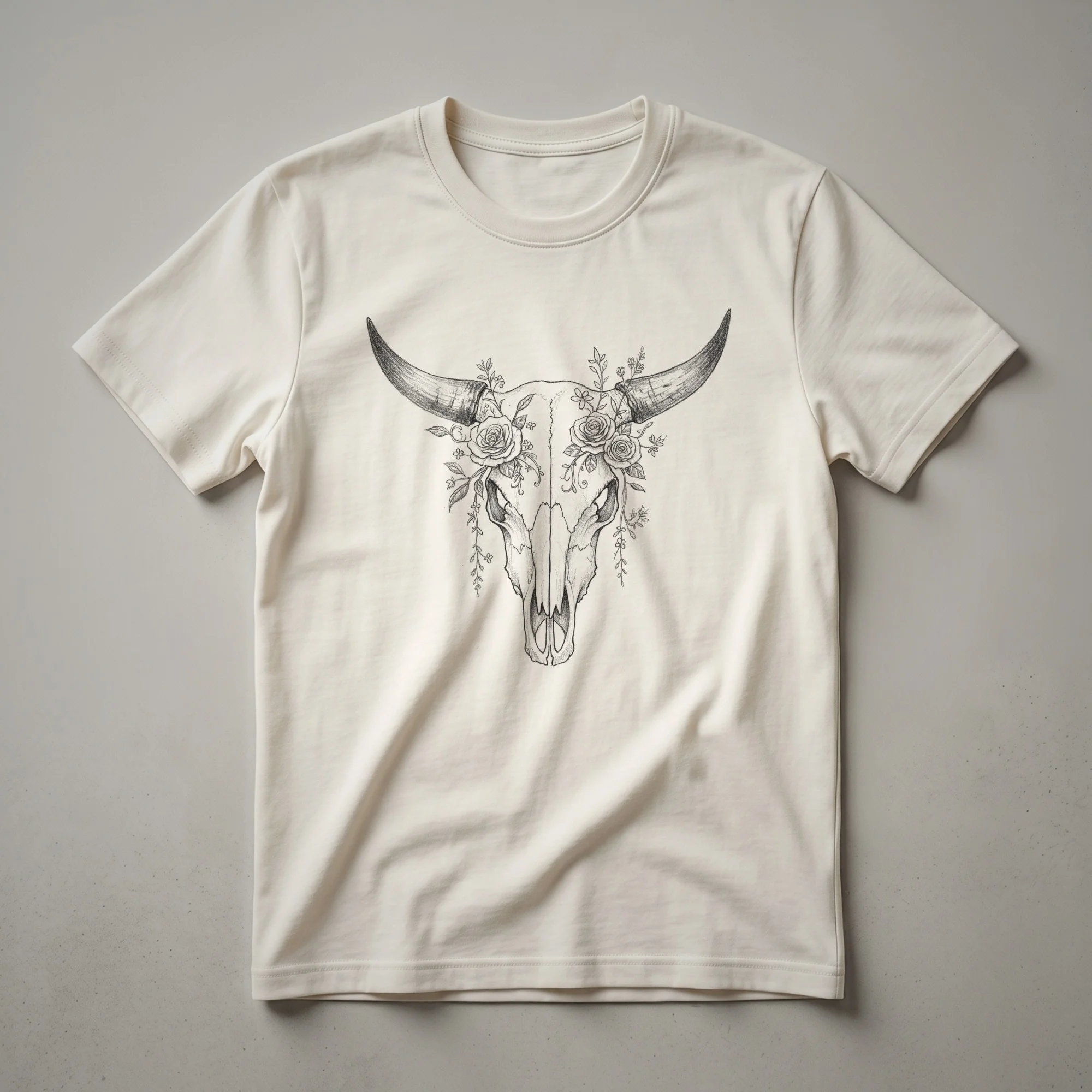 Nature lovers and fans of rustic aesthetics will appreciate this striking graphic tee featuring a stylized cow skull adorned with vibrant flowers. The design captures the essence of the wild, blending the stark imagery of a skull with the delicate beauty of blossoms. Cattle, including various breeds of domestic cows, are found worldwide, often grazing in open pastures and meadows, which are integral parts of many natural landscapes. This t-shirt serves as a unique statement piece for anyone who feels a connection to the outdoors, wildlife, or the rugged beauty of the natural world. It's a thoughtful gift for hikers, birdwatchers, or anyone who enjoys the symbolism of nature's cycles. Wear this shirt on your next outdoor adventure or casual outing to express your appreciation for the wild. This eye-catching shirt is a staple for any nature enthusiast's wardrobe. The intricate details of the floral arrangement against the skull create a visually captivating piece that resonates with the spirit of the wilderness.