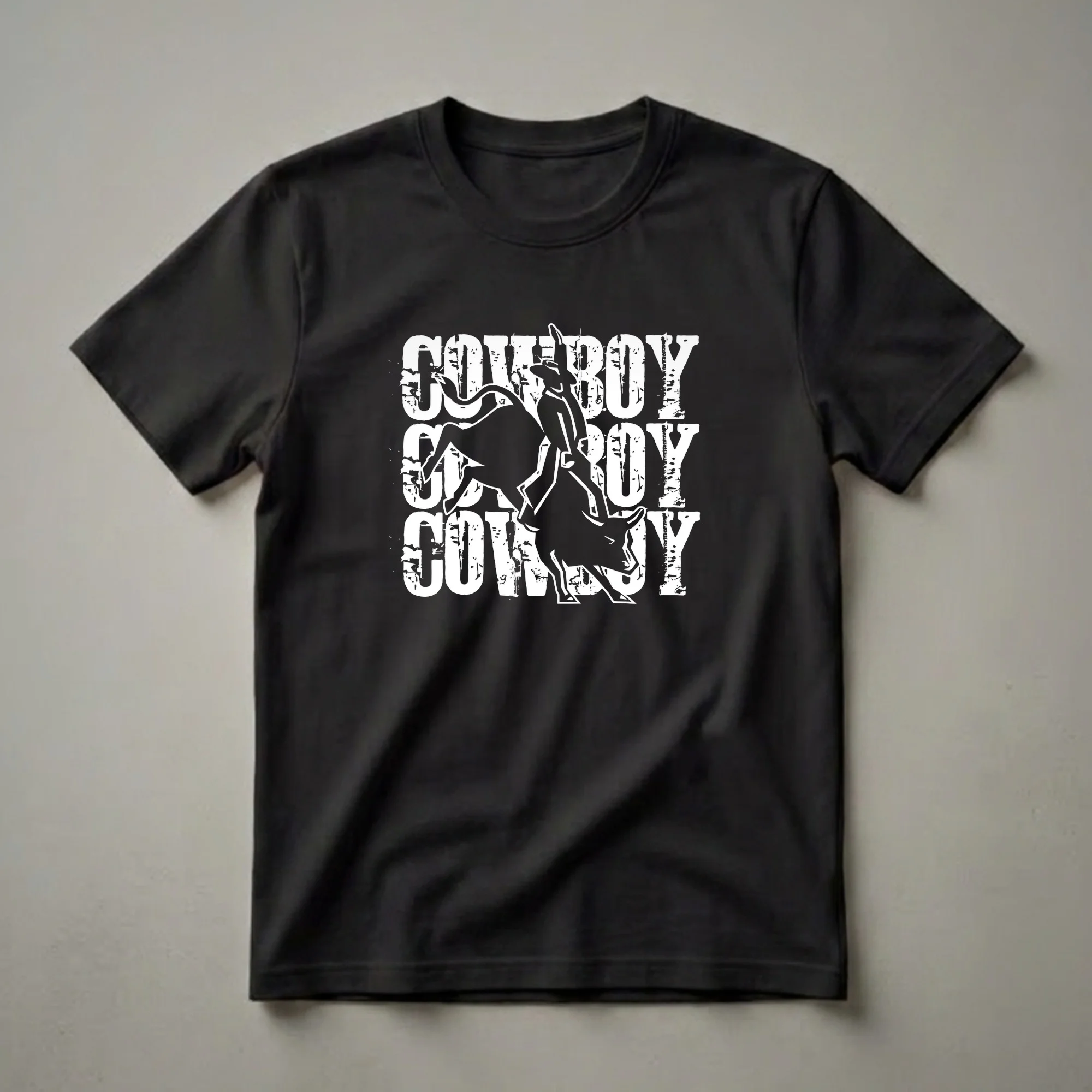 Cowboy culture and the thrill of the rodeo are captured in this eye-catching graphic tee. The design prominently features a dynamic illustration of a cowboy expertly riding a bucking bull, a quintessential image of the rodeo circuit. The word "COWBOY" is repeated vertically in a distressed, bold font, reinforcing the theme. This shirt is for anyone who appreciates the grit and excitement of country western life, from the ranch to the arena. Rodeo events, like bull riding, are a significant part of American heritage, demanding incredible skill, courage, and athleticism from participants. This t-shirt serves as a wearable tribute to that spirit. It makes a thoughtful gift for the cowboy or cowgirl in your life, or for anyone who dreams of the open range and the roar of the crowd. Wear this tee to your next country music concert, a casual day out, or while watching your favorite rodeo competition. It’s a staple for those who embrace the cowboy way of life and the enduring allure of the American West.