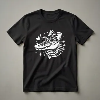 Alligator moms who appreciate a touch of whimsy will adore this eye-catching graphic tee. The design showcases a stylized alligator head adorned with oversized sunglasses, a chic bow, and a beaded necklace with a heart charm. Sparkling stars and hearts add a playful flair to the overall composition. Alligators, known for their powerful jaws and semi-aquatic lifestyle, inhabit freshwater environments across the southeastern United States. This unique t-shirt is a thoughtful gift for girls who love reptiles or anyone who enjoys quirky, animal-themed apparel. It's a fun choice for casual outings, school days, or just lounging around. This shirt is a go-to tee for expressing personality and a love for unique creatures. Imagine wearing this to a casual brunch or a fun day out with friends, sparking conversations with its distinctive design. This graphic shirt is sure to become a favorite in any wardrobe, offering a blend of cute and cool.