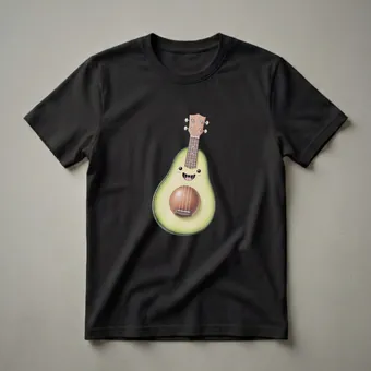 Ukulele players who appreciate a touch of whimsy will reach for this eye-catching graphic tee. The design features a halved avocado, its creamy interior transformed into the resonant body of a ukulele. The instrument's neck extends upwards, complete with tuning pegs and frets, all rendered in a charming, hand-drawn style. A cheerful face with rosy cheeks, wide eyes, and a broad smile adorns the avocado's flesh, bringing the fruit to life. This unique t-shirt blends the joy of playing the ukulele with the universal appeal of avocados, creating a playful and memorable visual. It's a thoughtful gift for any musician who enjoys a bit of fun with their melodies or for someone who simply loves unique, fruit-inspired art. This shirt works well for casual outings, music practice sessions, or as a conversation starter at gatherings. The ukulele, a small stringed instrument with a bright, cheerful tone, is a popular choice for beginners and experienced players alike, making this design relatable to a wide audience. Embrace your passion for music and healthy eating with this delightful piece of apparel.