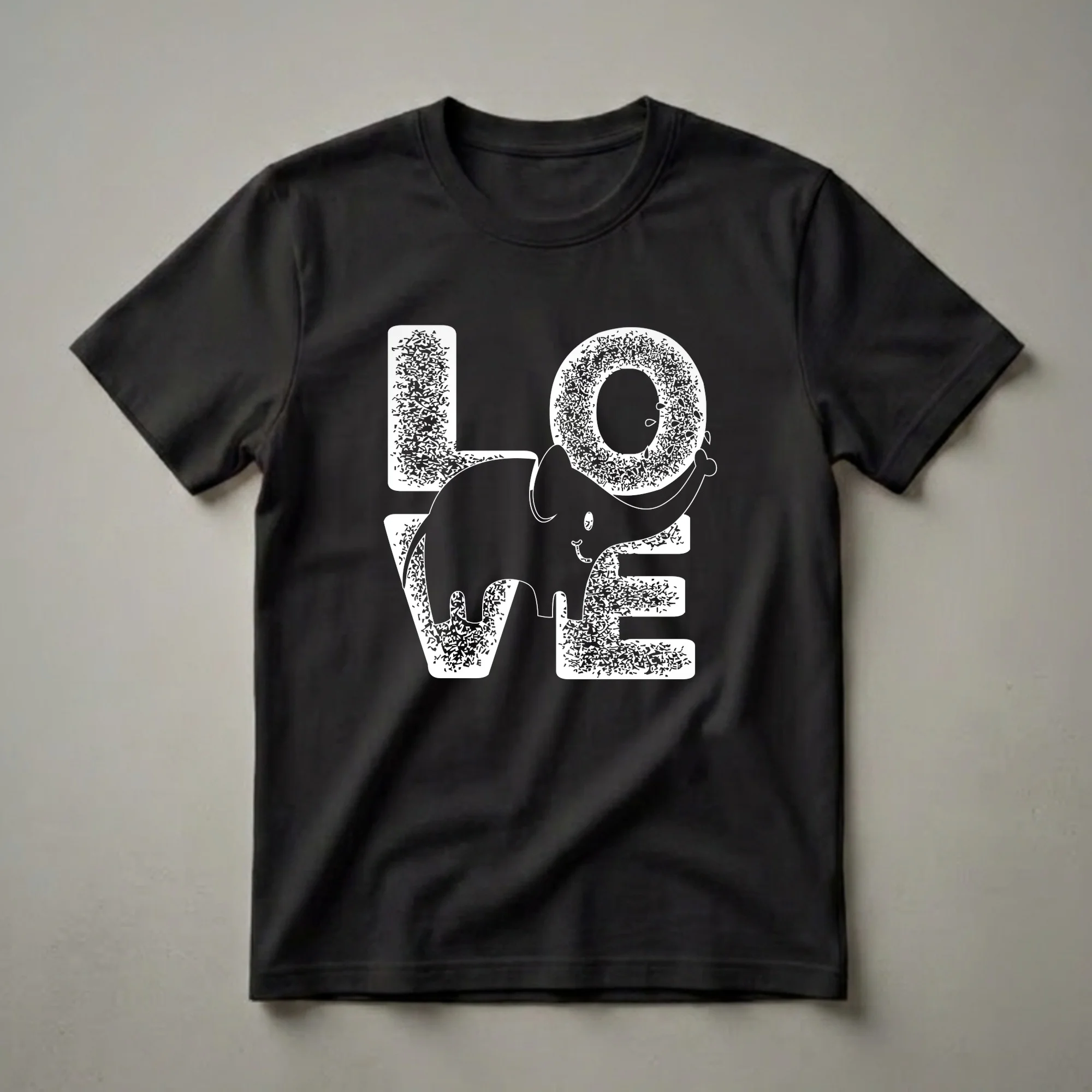 Animal lovers who adore elephants will reach for this eye-catching graphic tee. The design features the word 'LOVE' in a distressed white outline, with a charming, smiling elephant playfully integrated into the letter 'O'. This shirt celebrates the gentle nature and intelligence of elephants, creatures known for their strong family bonds and remarkable memory. Elephants, the largest land mammals, inhabit diverse environments across Africa and Asia, playing a crucial role in their ecosystems. This t-shirt is a thoughtful gift for anyone who has a soft spot for these magnificent animals. Wear this shirt to casual outings, wildlife events, or simply to express your passion for elephants. It's a staple in the collection for any dedicated animal enthusiast. This graphic tee makes a thoughtful gift for birthdays, holidays, or just because.