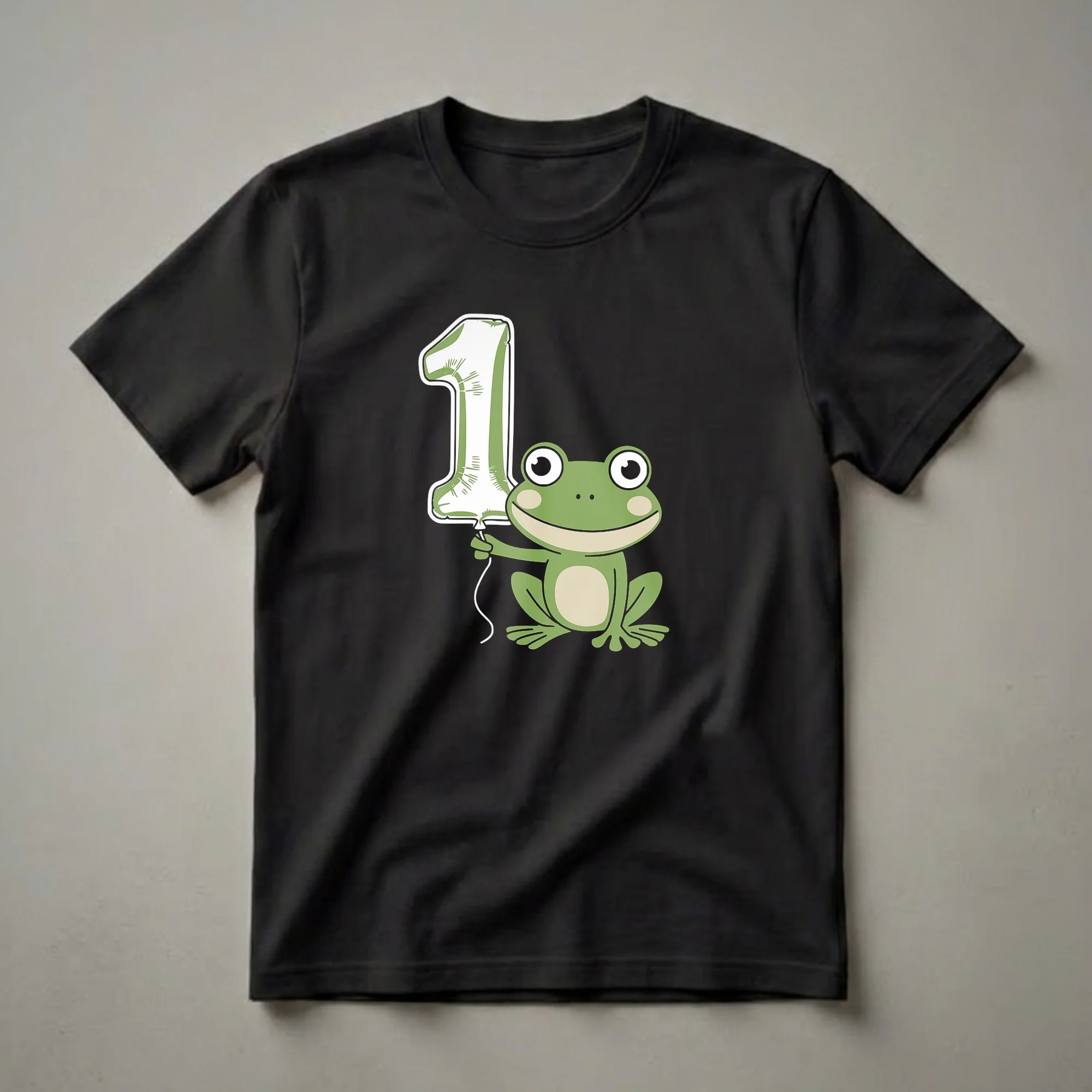Turning one is a momentous occasion, and this charming frog graphic tee is ready to hop into the celebration. The design features a friendly, cartoon-style green frog with big, curious eyes and rosy cheeks, sitting contentedly. In its hand, the frog holds a large, white balloon shaped like the number '1', complete with subtle green line details to give it a textured appearance. This shirt is a thoughtful gift for any parent or grandparent looking for a special outfit for their little one's first birthday party. Frogs are known for their incredible leaping abilities, with some species capable of jumping many times their own body length, a fitting metaphor for a child's rapid growth and development in their first year. This t-shirt is a delightful way to commemorate this milestone. It's a go-to tee for birthday photos, cake smash sessions, or simply for everyday wear as a reminder of this special day. Imagine your little one wearing this cheerful shirt as they explore the world around them, just like a curious frog exploring its pond.