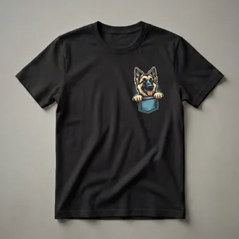 German Shepherd owners who want to wear their affection on their sleeve will reach for this eye-catching graphic tee. The design features a charming, stylized illustration of a German Shepherd puppy peeking out from a blue pocket. Its tongue is playfully sticking out, and its paws are resting on the edge of the pocket, giving the impression it's about to jump out and greet you. The German Shepherd breed, known for its intelligence, courage, and loyalty, makes a striking visual on this unique shirt. These dogs were originally bred in Germany for herding sheep, showcasing their working dog heritage. This t-shirt is a wonderful way for any proud German Shepherd mom or dad to express their connection to their canine companion. It makes a thoughtful gift for birthdays, holidays, or just because for the dog lover in your life. Wear this shirt to your next dog park visit, casual outing, or while relaxing at home with your furry friend.
