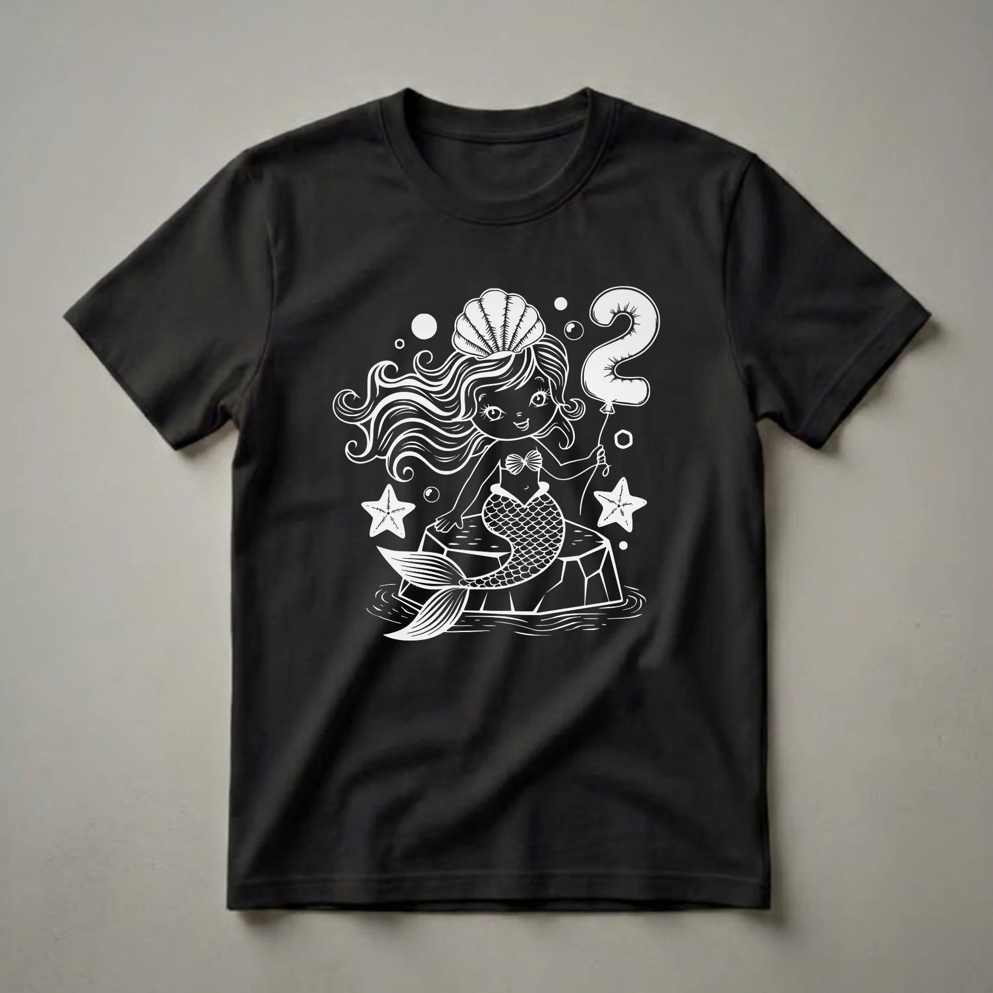 Two-year-old girls will adore this enchanting mermaid t-shirt, celebrating their special second birthday. The design showcases a whimsical cartoon mermaid, complete with a seashell bra and a decorative seashell atop her flowing hair. She sits perched on a rock, a symbol of the ocean's mysteries, while holding a large, inflated balloon shaped like the number two. Bubbles float around her, adding to the underwater magic, and two starfish flank the scene, hinting at the vibrant marine life. This graphic tee is a delightful way for a little girl to mark her milestone birthday, whether she's a fan of fairy tales or the wonders of the sea. Mermaids, mythical creatures of the ocean, have captivated imaginations for centuries, and this design brings that enchantment to life. This shirt makes a thoughtful gift for any two-year-old girl who dreams of underwater adventures. It's a wonderful choice for birthday parties, family photos, or just everyday wear, allowing her to showcase her big day with a touch of fantasy. Imagine her delight as she wears this special shirt, feeling like a true princess of the sea on her second birthday.