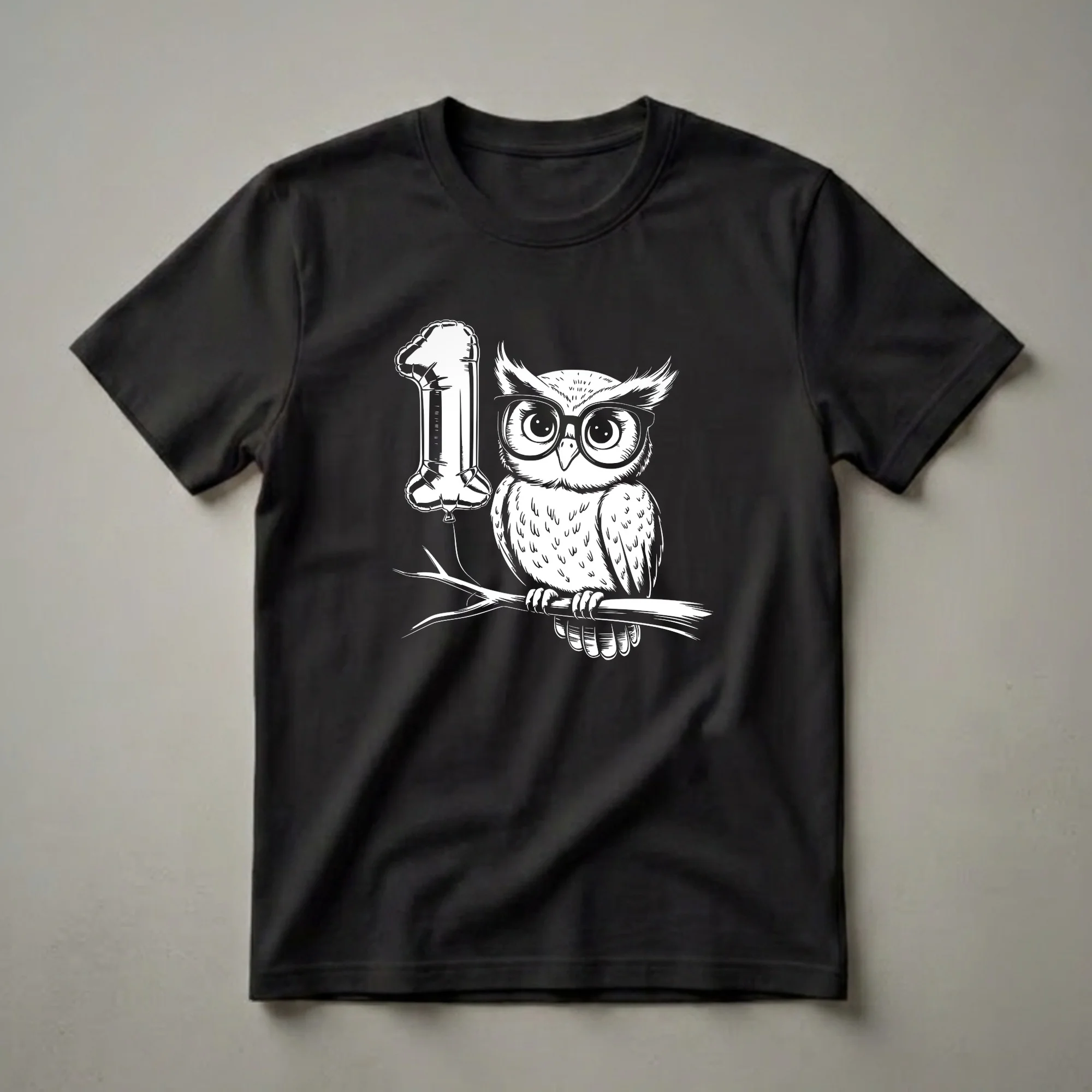 Turning one is a momentous occasion, and this charming graphic tee is here to celebrate! This shirt features a whimsical illustration of a wise-looking owl perched on a branch, sporting a pair of stylish glasses. Beside the owl floats a shiny balloon shaped like the number '1', perfectly symbolizing this special milestone. Owls are known for their keen eyesight and nocturnal habits, often found in forests and woodlands. This eye-catching design makes a delightful present for any little one celebrating their very first birthday. Imagine your toddler wearing this unique t-shirt to their birthday party or for a special photoshoot. It's a wonderful way to commemorate their first year and create lasting memories. This comfortable shirt is a go-to choice for parents looking for a cute and memorable outfit for their one-year-old.