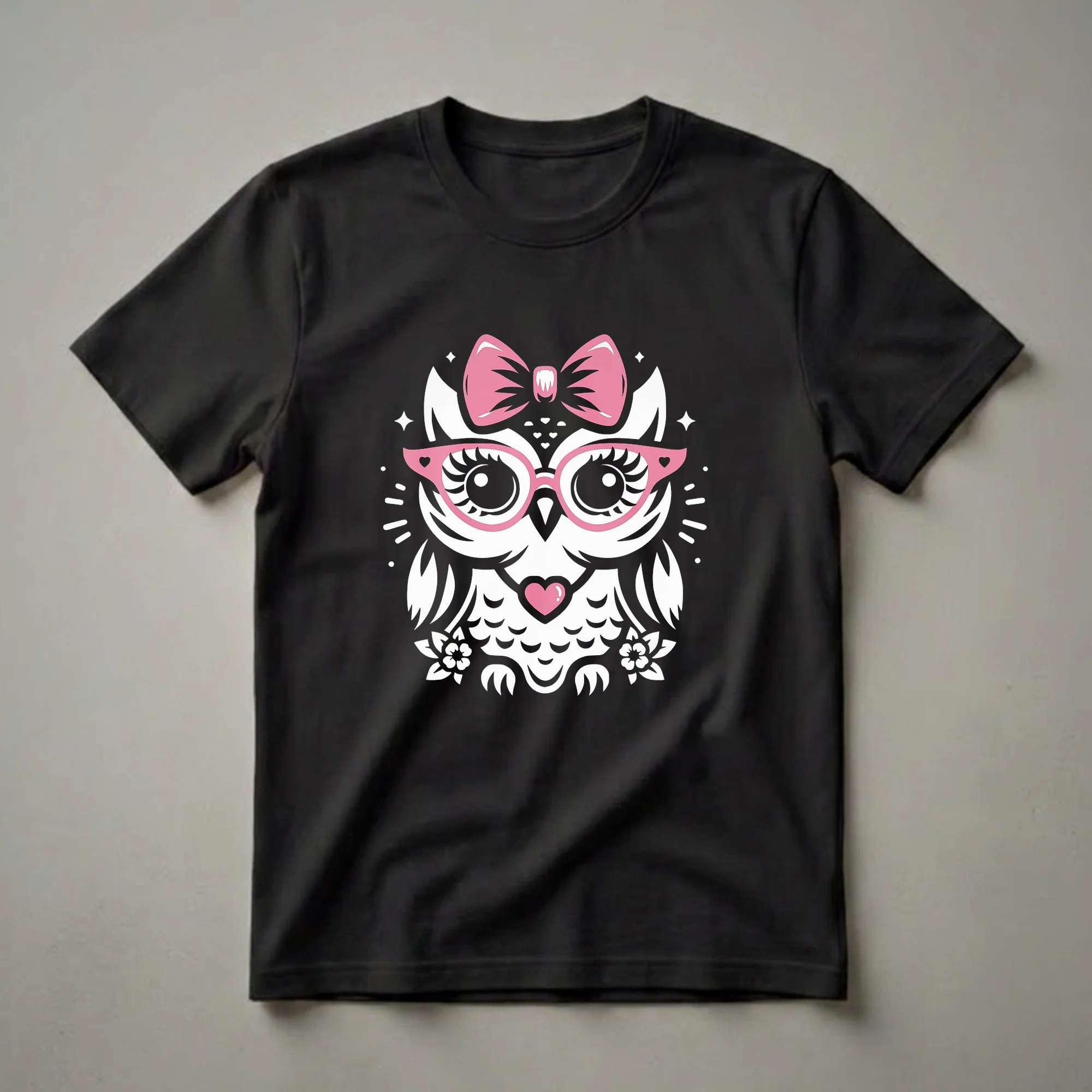 - Chic graphic tee for girls showcasing a stylized white owl with pink heart glasses and bow.