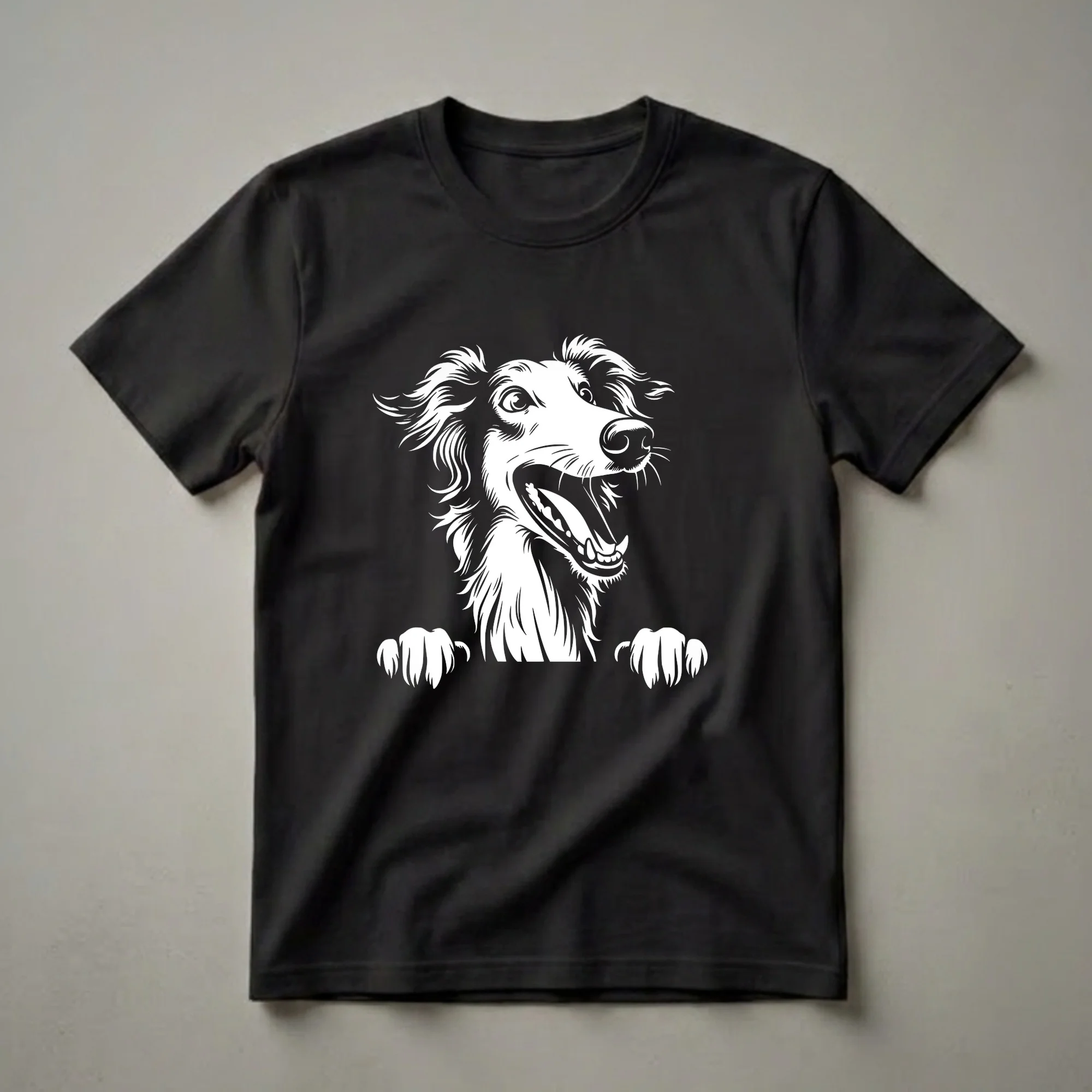 Borzoi owners know the distinctive elegance and gentle nature of this sighthound breed. This graphic tee captures that spirit with a playful peeking Borzoi design, rendered in a striking white outline against a dark background. The dog's happy expression and visible paws suggest it's eager to greet you, making this shirt a conversation starter. Borzoi dogs, also known as Russian Wolfhounds, were originally bred for coursing wolves and possess a unique combination of speed and grace. This t-shirt is a wonderful way for any Borzoi mom or dad to express their affection for their unique pet. It makes a thoughtful gift for birthdays, holidays, or just because. Wear this shirt to your next dog park visit or casual outing and let your Borzoi pride shine through. This comfortable tee is a staple in the collection for any devoted Borzoi enthusiast.