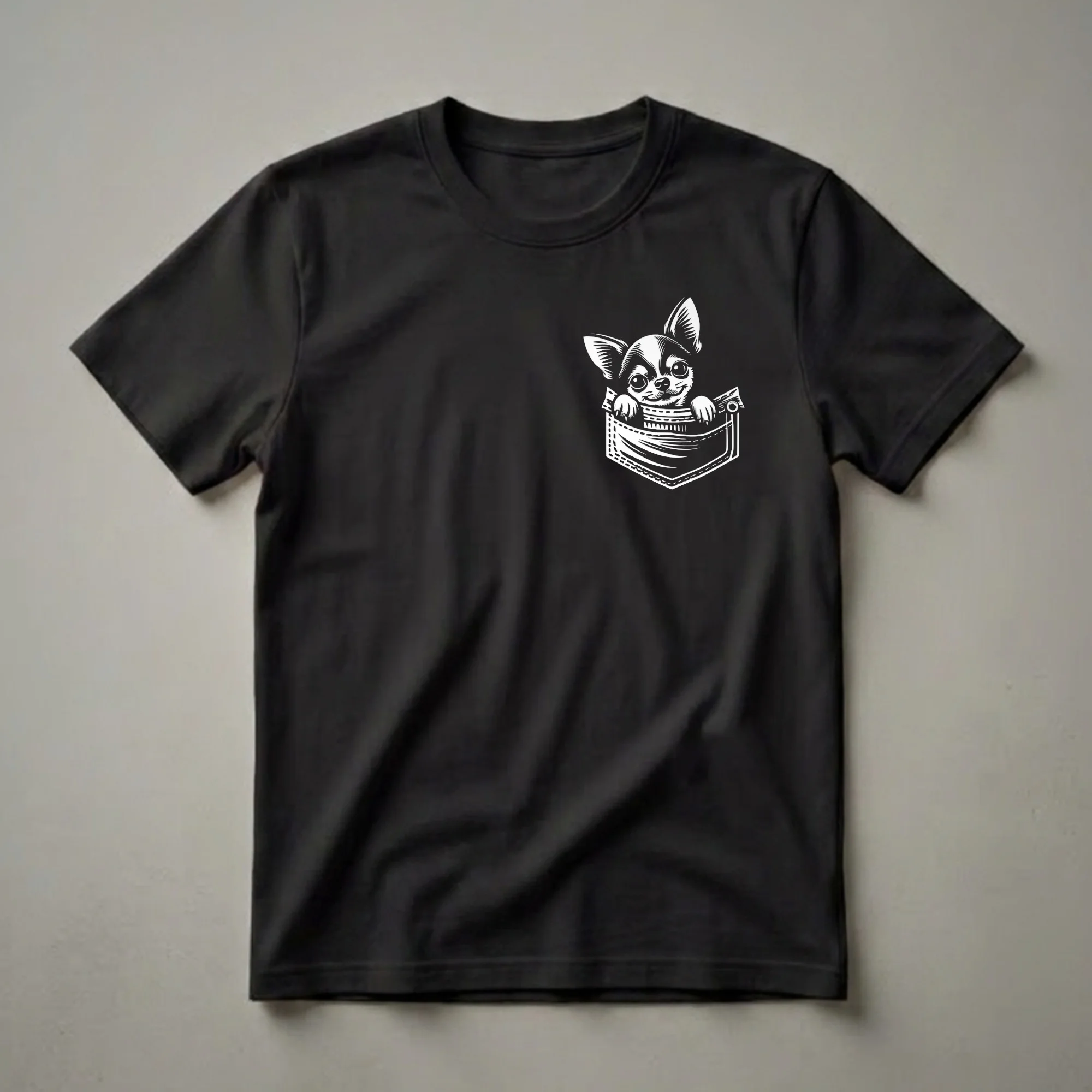 Show off your love for the spirited Chihuahua with this adorable graphic tee featuring a playful pup peeking from a faux pocket. This graphic tee features a delightful black and white illustration of a chihuahua peeking over the edge of a faux pocket, its large eyes and perky ears instantly recognizable. Chihuahuas, originating from Mexico, are known for their compact size and bold character, often forming strong bonds with their owners. This t-shirt is a wonderful way for any chihuahua mom or dad to express their affection for their furry friend. It makes a thoughtful gift for birthdays, holidays, or just because for the chihuahua enthusiast in your life. Wear this shirt to casual outings, dog park visits, or simply while relaxing at home with your beloved pet. It's a staple in the collection for anyone who cherishes their chihuahua.