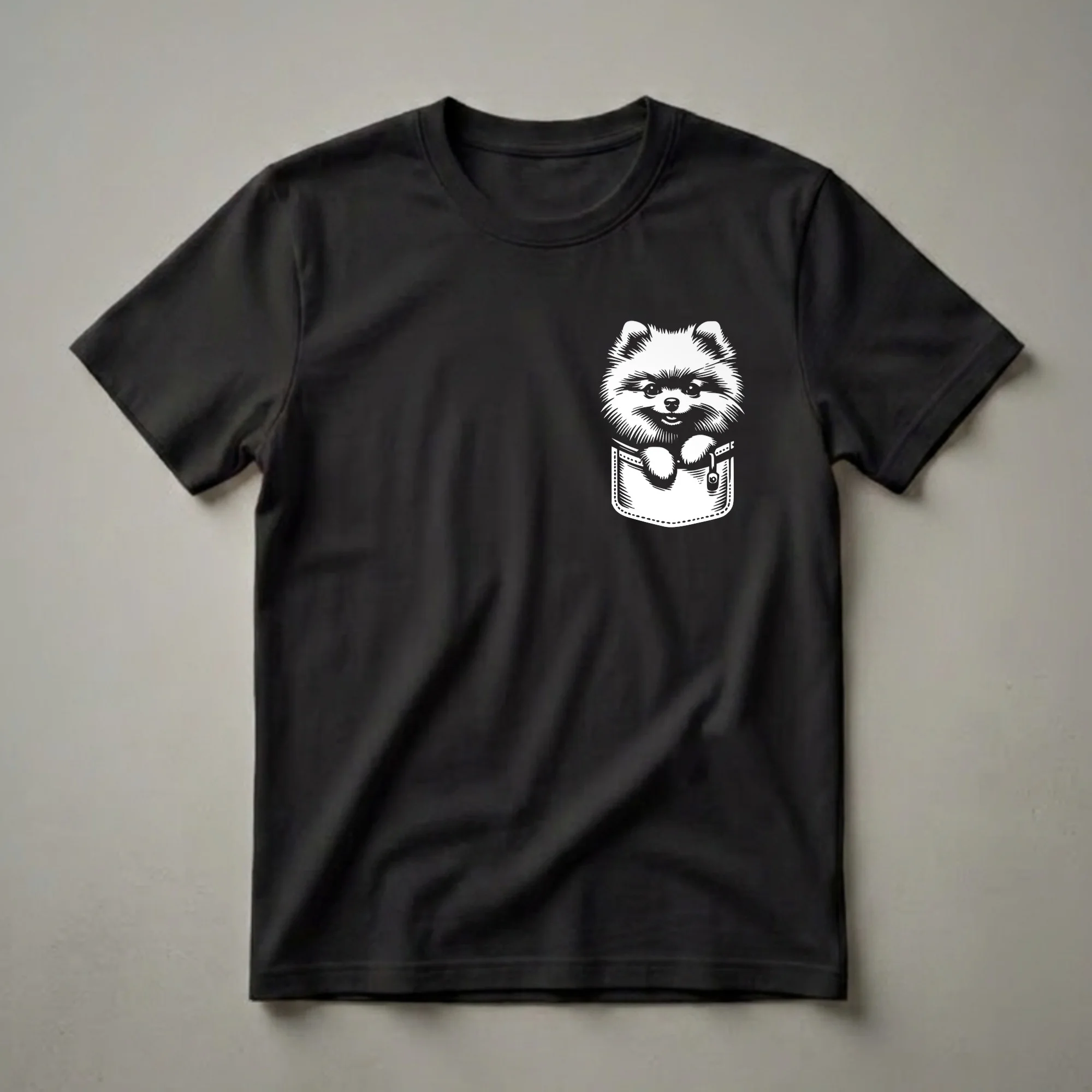 Pomeranian moms and dads know the joy these fluffy companions bring into their lives. This eye-catching graphic tee features a charming Pomeranian peeking out from a stylized pocket, rendered in a striking black and white design. Pomeranians, known for their spirited personalities and fox-like faces, are a beloved toy breed originating from the Pomerania region of Central Europe. This shirt is a wonderful way for any Pomeranian owner to express their affection for their furry friend. It makes a thoughtful gift for birthdays, holidays, or just because for the Pomeranian enthusiast in your life. Wear this comfortable t-shirt to casual outings, dog park visits, or while relaxing at home with your beloved pet. It's a staple in the collection for anyone who adores these spirited little dogs.