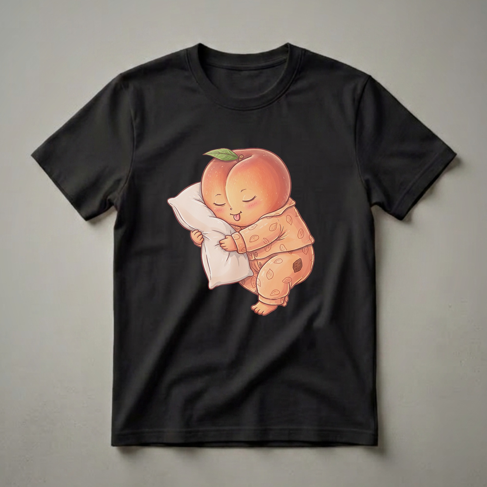 Peaches are a beloved stone fruit, known for their fuzzy skin and sweet, juicy flesh. They thrive in temperate climates and are often associated with summer harvests and warm weather. This eye-catching graphic tee showcases a whimsical interpretation of a peach, depicted as a cute character dressed in pajamas and sound asleep while hugging a fluffy white pillow. The character's eyes are closed with rosy cheeks, and its tongue is playfully sticking out, adding to its charming and endearing appeal. The pajamas themselves are a soft orange hue, adorned with a repeating pattern of smaller, stylized peach shapes. This t-shirt is a thoughtful gift for anyone who appreciates playful food-themed designs, enjoys a good night's sleep, or simply loves the sweet nature of peaches. It's a delightful piece of apparel that brings a smile to your face, well suited for lounging at home or wearing to a casual gathering. This shirt works well for those who enjoy unique and humorous graphic tees, making it a go-to item for relaxed days.