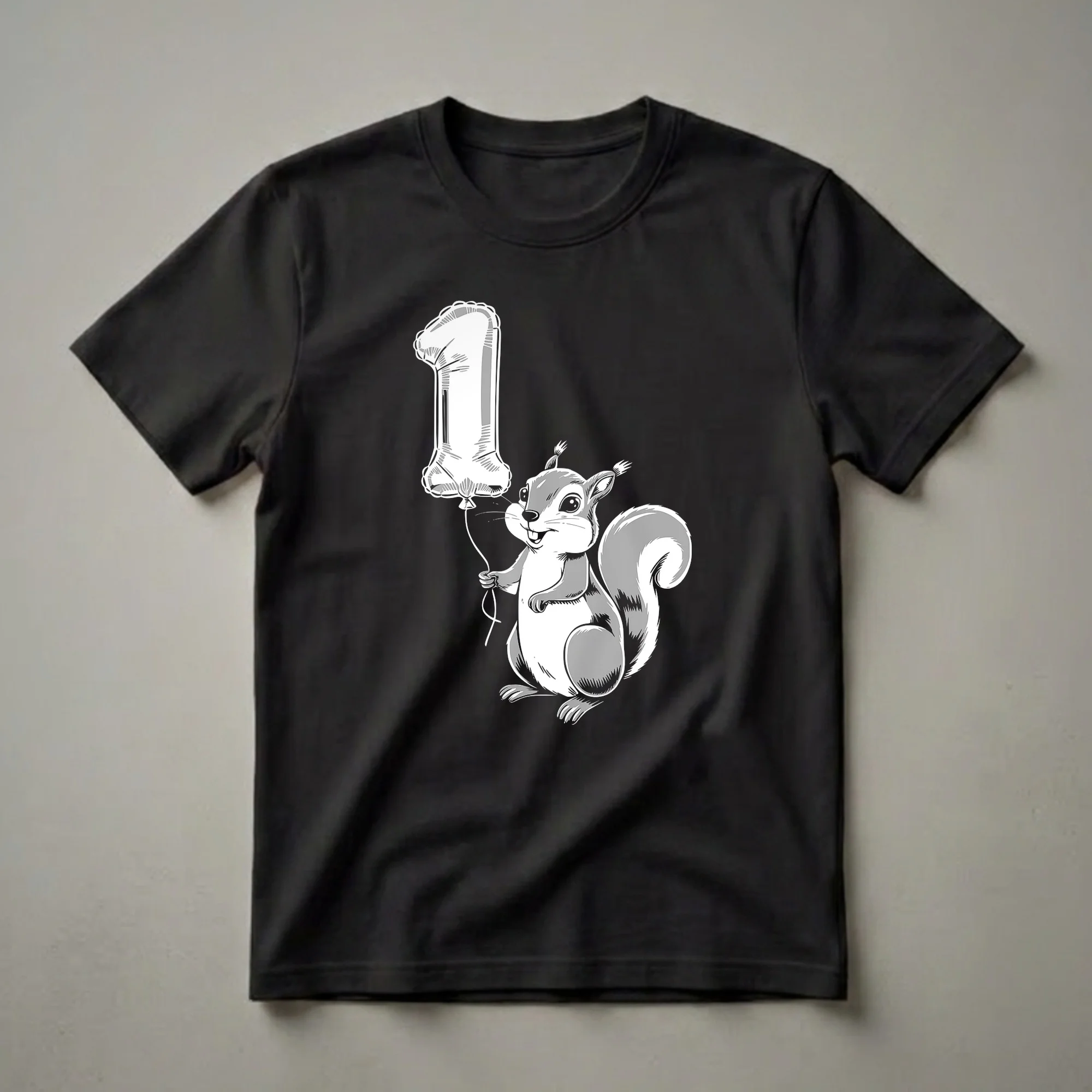 For parents planning a first birthday celebration, this charming t-shirt captures the joy of turning one. The design features a whimsical cartoon squirrel, rendered in a classic grayscale illustration style, happily holding a large, shiny balloon shaped like the number '1'. Squirrels are known for their energetic nature and their habit of gathering nuts, often seen scampering through parks and forests, making them a relatable and playful symbol for a young child's adventurous spirit. This graphic tee is a delightful choice for the birthday boy or girl turning one year old. It’s a thoughtful gift for a parent looking for a unique outfit for their little one's milestone birthday party, cake smash session, or family photos. Imagine your little one wearing this cute squirrel shirt as they explore their new world, marking their very first year with a touch of woodland charm. This shirt works well for any toddler celebrating their inaugural birthday, offering a fun and memorable way to commemorate the occasion.