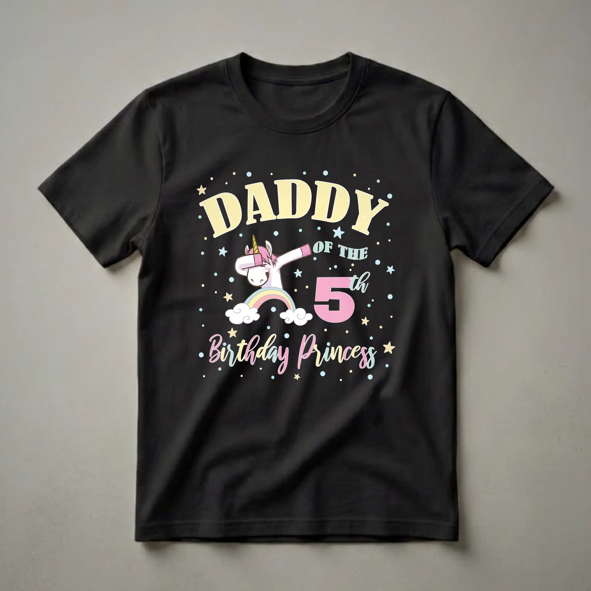 Fathers who have daughters celebrating their 5th birthday will reach for this eye-catching graphic tee. The design features a whimsical unicorn performing a popular dab dance move, set against a backdrop of colorful stars and confetti. This unicorn is not just any mythical creature; it's a symbol of magic and wonder, often associated with childhood dreams and fantasy. The text clearly states "Daddy Of The 5th Birthday Princess," making it a perfect declaration of pride for any father whose little girl is turning five. Five is a significant milestone, marking the transition from early childhood into a more curious and engaged stage of development, often the start of kindergarten. This shirt is a fun way for dads to join in the celebration, whether at a birthday party, a family gathering, or a casual outing. It makes a thoughtful gift for any dad who wants to show off his "birthday princess" and her love for all things magical and fun. This t-shirt is a playful addition to any dad's casual wardrobe, celebrating a special birthday moment.