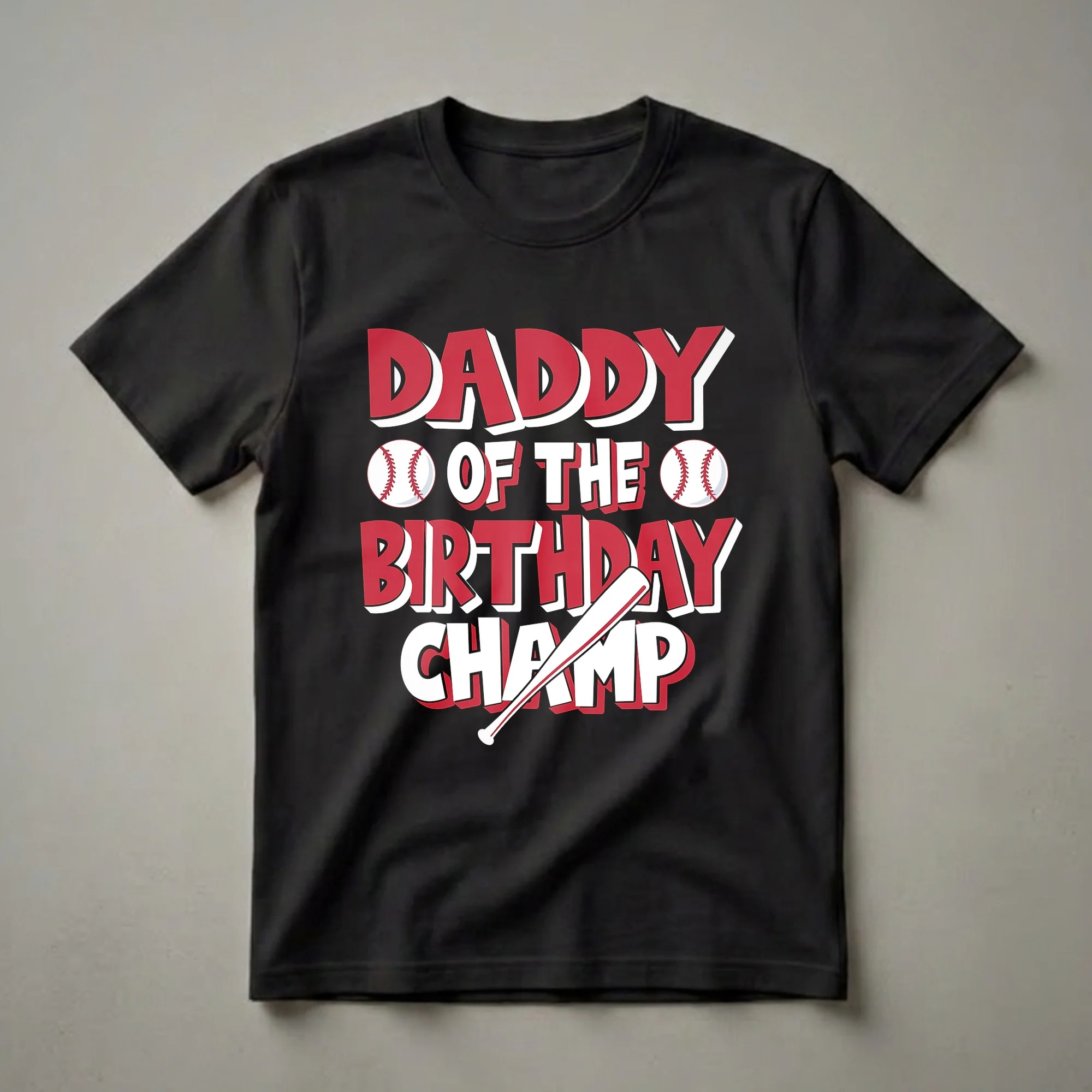 Dads who love baseball will reach for this "Daddy Of The Birthday Champ" tee to celebrate their child's special day. The design features bold, stylized red and white lettering that pops against a black background, accented with classic baseball graphics and a baseball bat. This shirt is a home run for any father whose son or daughter is the star player on their birthday. Baseball is a sport deeply ingrained in American culture, often symbolizing family traditions and summer fun. This t-shirt captures that spirit, making it a thoughtful gift for the dad who cheers loudest from the sidelines. Whether it's for a birthday party, a casual outing, or just to show off his proud dad status, this graphic tee is a winning choice. It’s a great way for him to feel connected to the celebration and his little slugger. This shirt is a staple for any baseball-loving dad celebrating a birthday milestone. Imagine him wearing this to the ballpark or a birthday gathering, proudly displaying his role as the "Daddy Of The Birthday Champ." It's more than just apparel; it's a declaration of pride and a nod to his favorite sport.