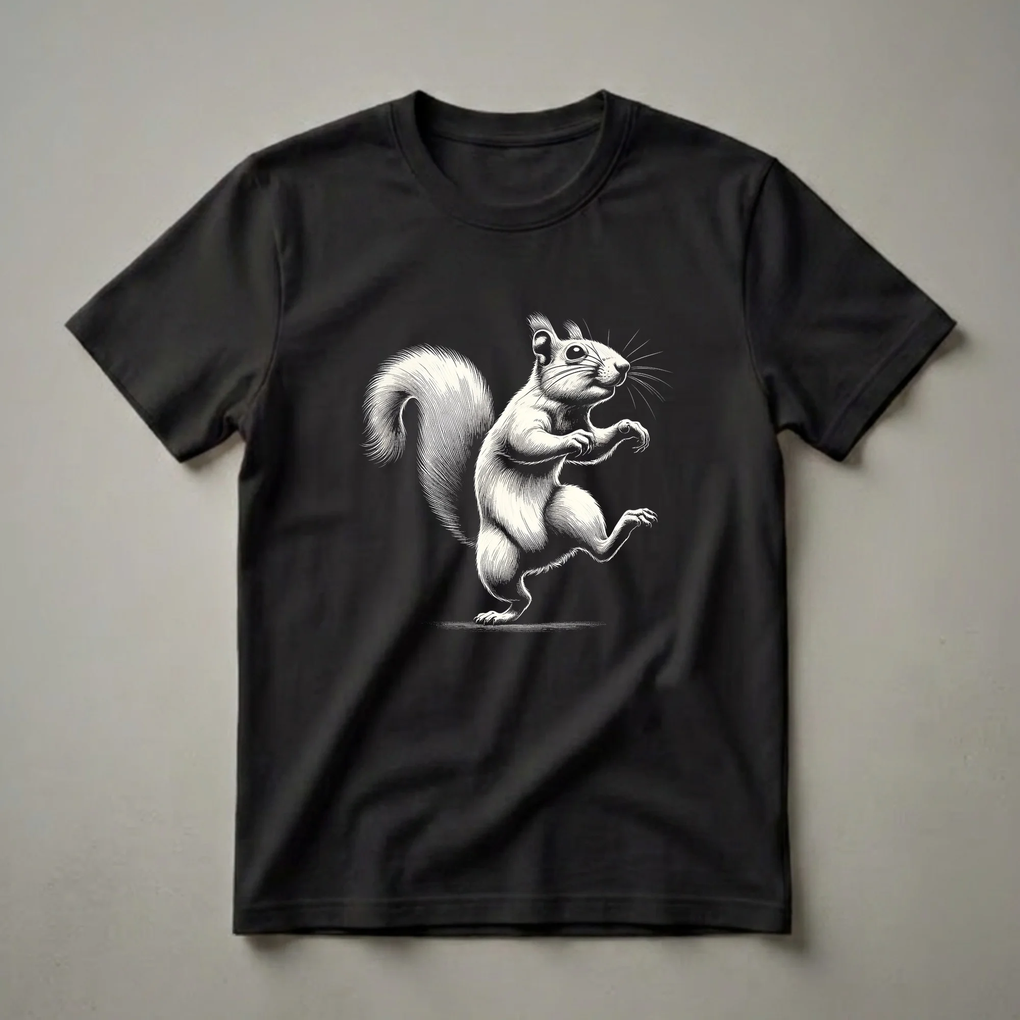 Squirrels are known for their energetic and often erratic movements as they scamper through trees and across lawns, gathering nuts and evading predators. This striking graphic tee captures that playful spirit with a detailed scratchboard illustration of a squirrel in mid-dance. The monochromatic design, rendered in crisp white lines against a deep black background, highlights the intricate texture of the squirrel's fur and its bushy tail. Its pose is dynamic, with one leg extended and claws out, suggesting a lively jig or a moment of pure, unadulterated joy. This shirt is a thoughtful gift for any animal lover with a sense of humor, particularly those who find amusement in the antics of backyard wildlife. It's a conversation starter, great to wear to casual gatherings, game nights, or just lounging around the house. The detailed artwork makes this t-shirt a standout piece for anyone who enjoys unique and artistic apparel. Squirrels, scientifically classified within the family Sciuridae, are found across the globe, inhabiting diverse environments from forests to urban parks, and their busy lives often provide moments of unexpected entertainment.