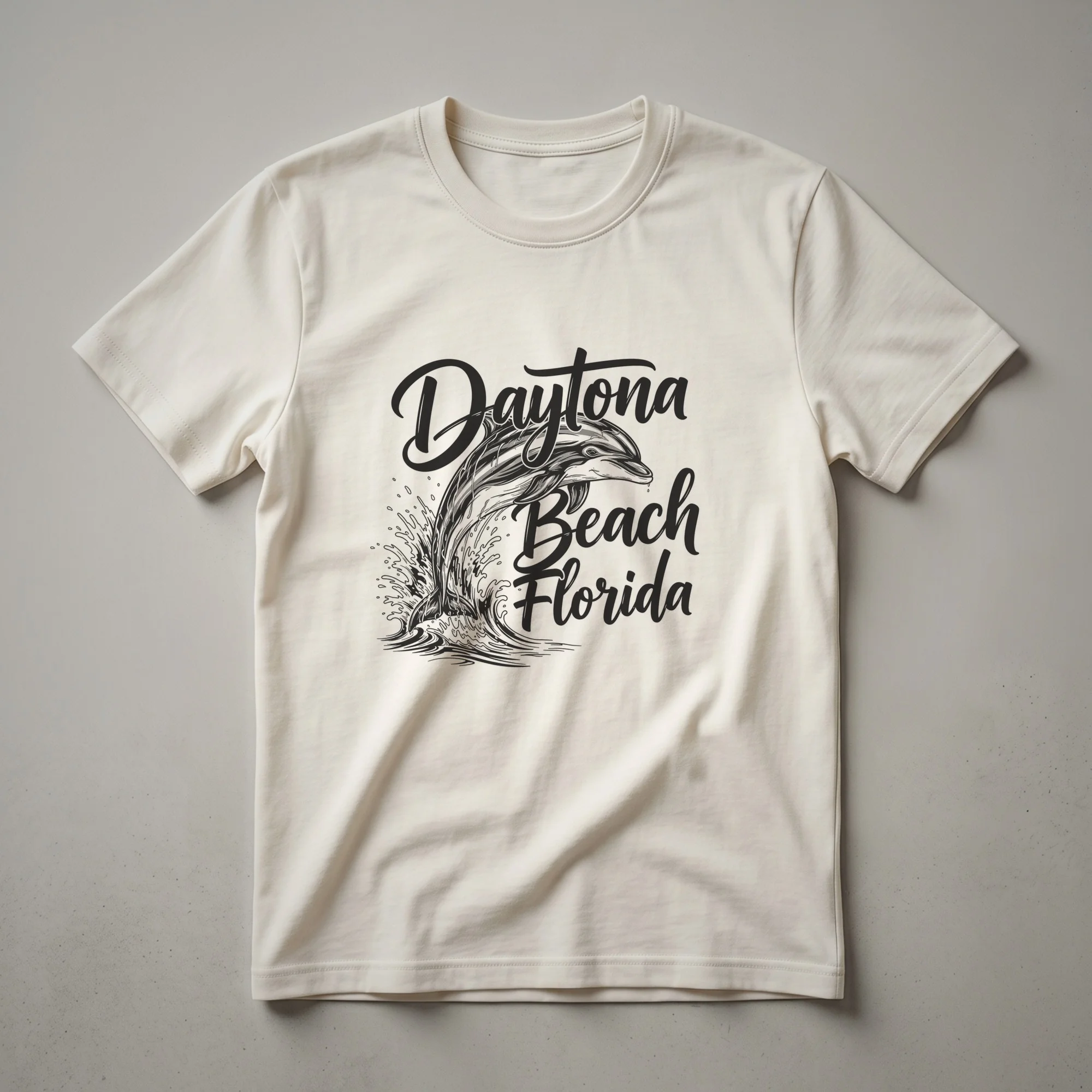 Daytona Beach, Florida, is a renowned destination celebrated for its wide sandy shores and vibrant atmosphere. This graphic tee captures the spirit of the coast with a dynamic design. It features a leaping dolphin, a common sight in the Atlantic waters off Florida's coast, depicted mid-air amidst stylized waves. The words 'Daytona Beach Florida' are elegantly rendered in a flowing script font, anchoring the design to this iconic East Coast city. This shirt is a thoughtful gift for anyone who has fond memories of visiting Daytona Beach, whether for its famous raceway, its car culture, or simply its beautiful coastline. It's a staple for Florida residents and a cherished souvenir for tourists. Wear this t-shirt to the beach, on a casual outing, or while reminiscing about sunny days spent by the ocean. It's a comfortable way to carry a piece of Florida with you, making it a go-to tee for beach lovers and travelers alike. This apparel celebrates the unique charm of Daytona Beach, making it a distinctive addition to any wardrobe.