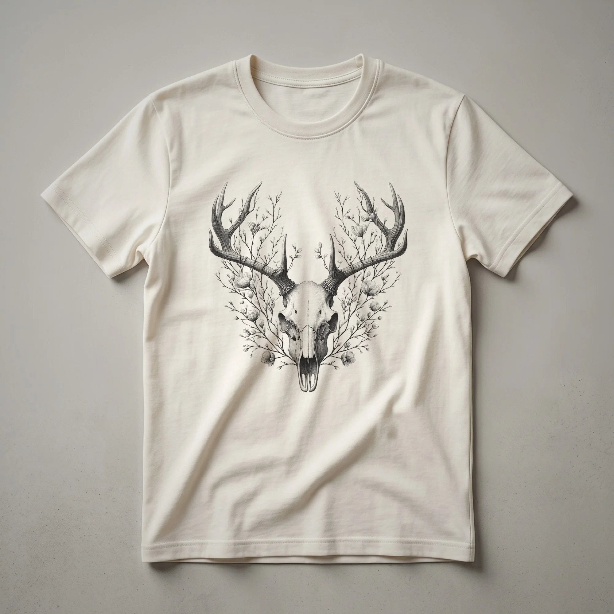 - Gear up for the wilderness with this striking deer skull and floral graphic t-shirt.