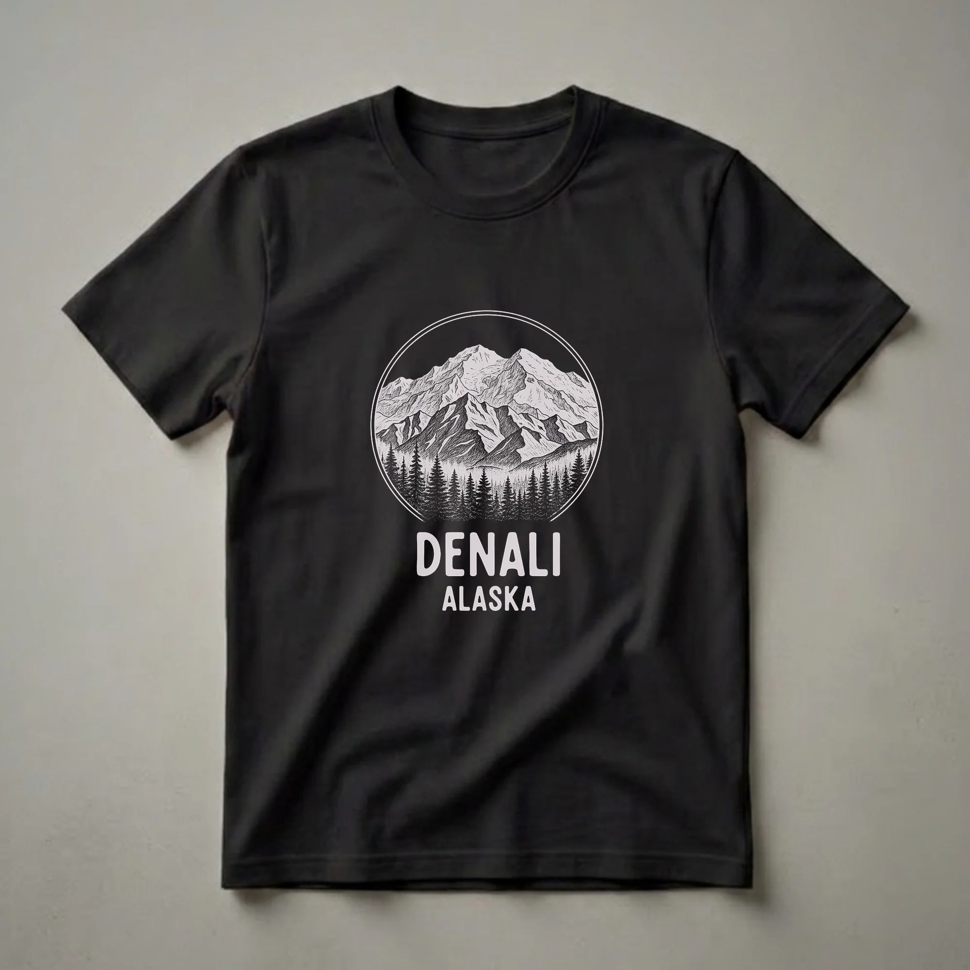 Denali rises to 20,310 feet above sea level, making it the tallest mountain in North America and the centerpiece of Denali National Park and Preserve, six million acres of subarctic Alaskan wilderness. This graphic tee captures that scale in a hand-drawn sketch style: jagged snow-capped peaks rise sharply inside a double-lined circular frame, their ridgelines detailed with fine crosshatch lines that suggest depth and stone texture. A dense silhouette of spruce and fir trees fills the foreground, representing the boreal forest that carpets the lower slopes. Below the circular badge, the words 'DENALI ALASKA' appear in bold, clean block letters. Alaska residents, backcountry hikers, and anyone who has stood in the shadow of Denali will recognize the drama of this landscape. The pencil-sketch technique gives the shirt a field-journal quality, the kind of image that belongs on a nature journal cover or a national park commemorative print. Wear this tee on the trail, at a campfire, or while planning your next expedition to the Last Frontier. This shirt makes a thoughtful gift for the Alaska traveler, the wilderness photographer who chases remote summits, or the geography enthusiast who keeps a topographic map pinned to the wall. Anyone who loves the rugged, remote beauty of subarctic terrain will reach for this tee on their favorite casual days.