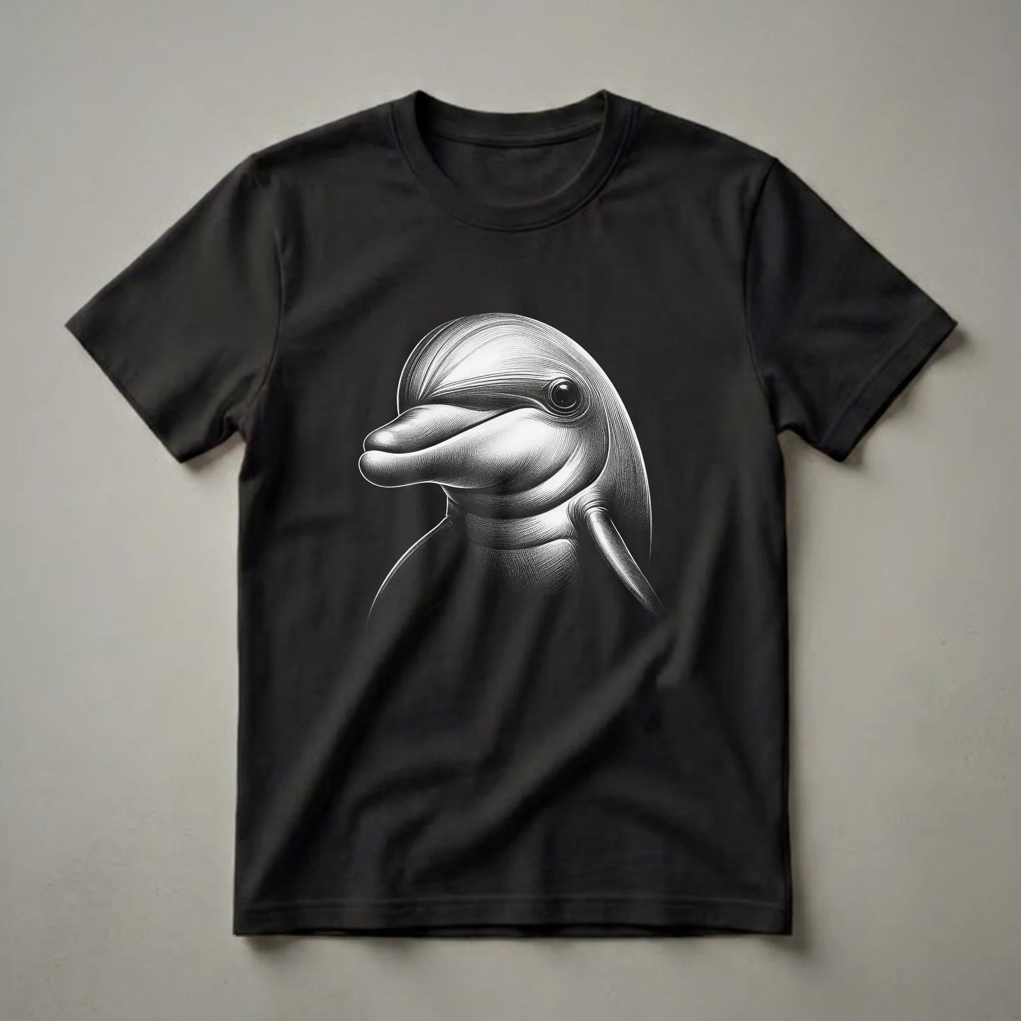 Young ocean enthusiasts will adore this t-shirt showcasing a skillfully rendered, monochromatic dolphin portrait using a unique cross-hatching artistic technique. This t-shirt features a detailed, monochromatic illustration of a dolphin's head, rendered with a distinctive cross-hatching technique that gives it a striking, almost sculpted appearance. The artwork focuses on the dolphin's sleek form and intelligent eye, presented against a stark black background that makes the marine mammal's features pop. This graphic tee is a thoughtful gift for any child, boy or girl, who is fascinated by ocean life and marine animals. It's also a great choice for adults who appreciate detailed wildlife art and want to wear their passion for the sea. This shirt works well for casual outings, school days, or as a conversation starter at aquariums or beach trips. The intricate linework of the dolphin artwork makes this more than just a shirt; it's a piece of art celebrating one of the ocean's most beloved inhabitants. Whether for a birthday or just because, this dolphin shirt is sure to be a hit with young ocean explorers and wildlife enthusiasts alike.