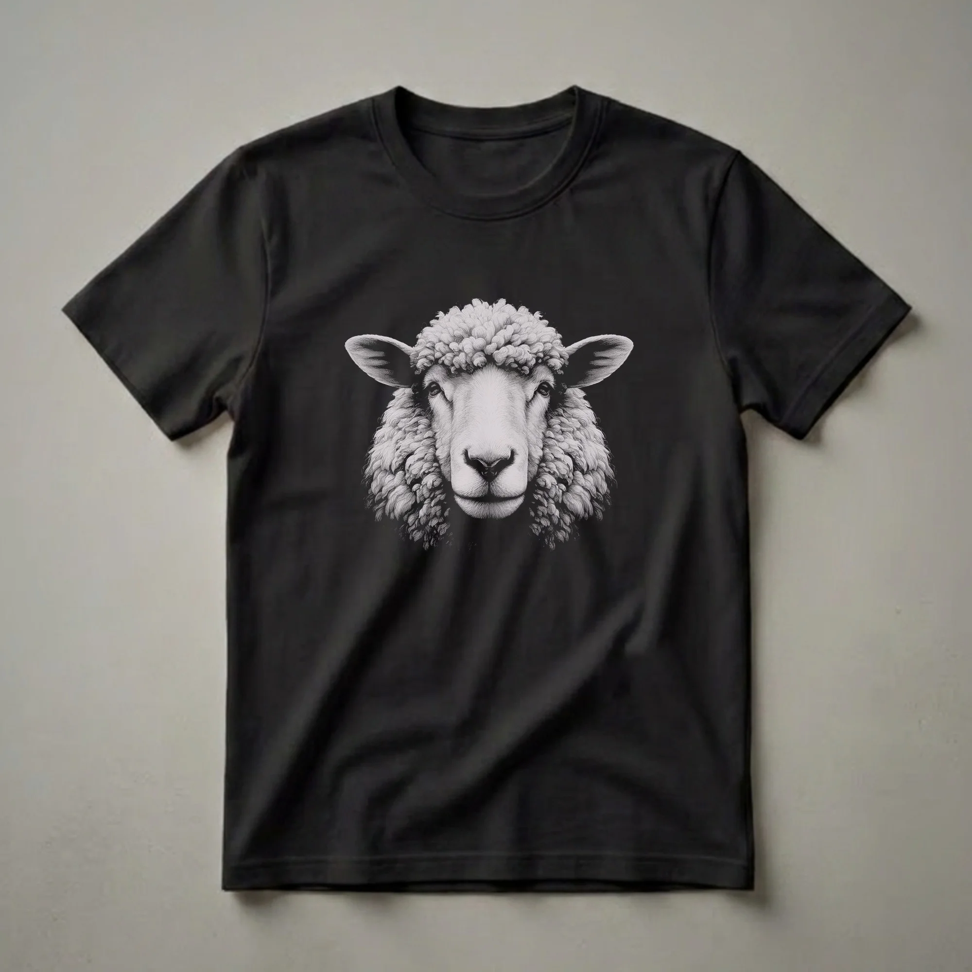 Wildlife enthusiasts and lovers of farm animals will appreciate the intricate detail in this sheep face graphic tee. The artwork features a realistic, black and white rendering of a sheep's head, capturing the texture of its woolly fleece and the gentle expression in its eyes. This striking design is presented against a stark black background, making the sheep's features pop. Sheep, scientifically known as Ovis aries, are domesticated ruminant mammals raised for their wool, meat, and milk. They are known for their docile nature and are often found grazing in pastures across the globe, forming an integral part of agricultural landscapes. This t-shirt is a thoughtful gift for anyone who admires these animals, whether they are a farmer, a shepherd, or simply someone who appreciates detailed wildlife art. It makes a thoughtful conversation starter and is a staple in the collection for those who enjoy unique apparel. Wear this shirt to a country fair, a farmer's market, or simply when you want to express your connection to the natural world.