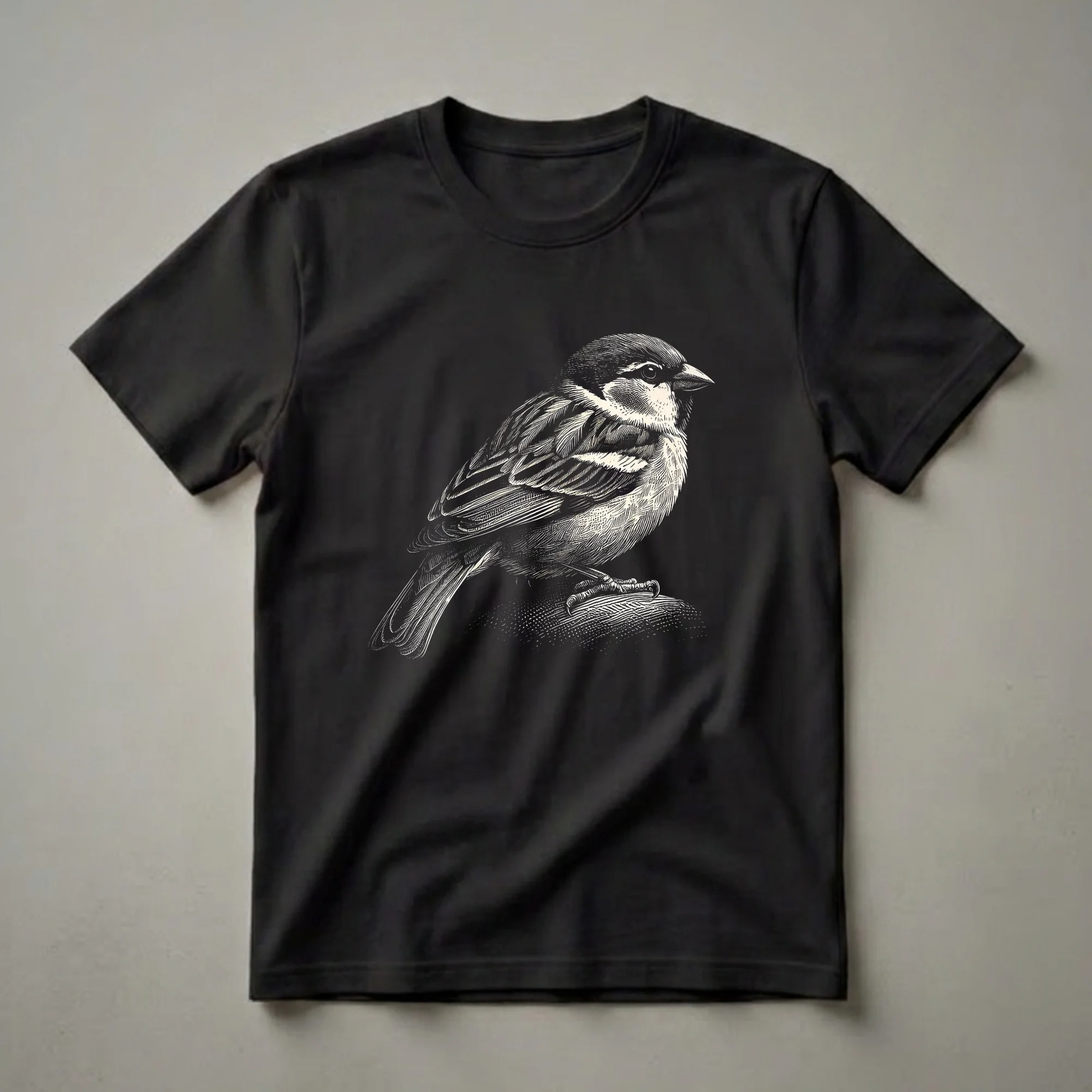 - Features a detailed, vintage-style graphic art design of a sparrow.