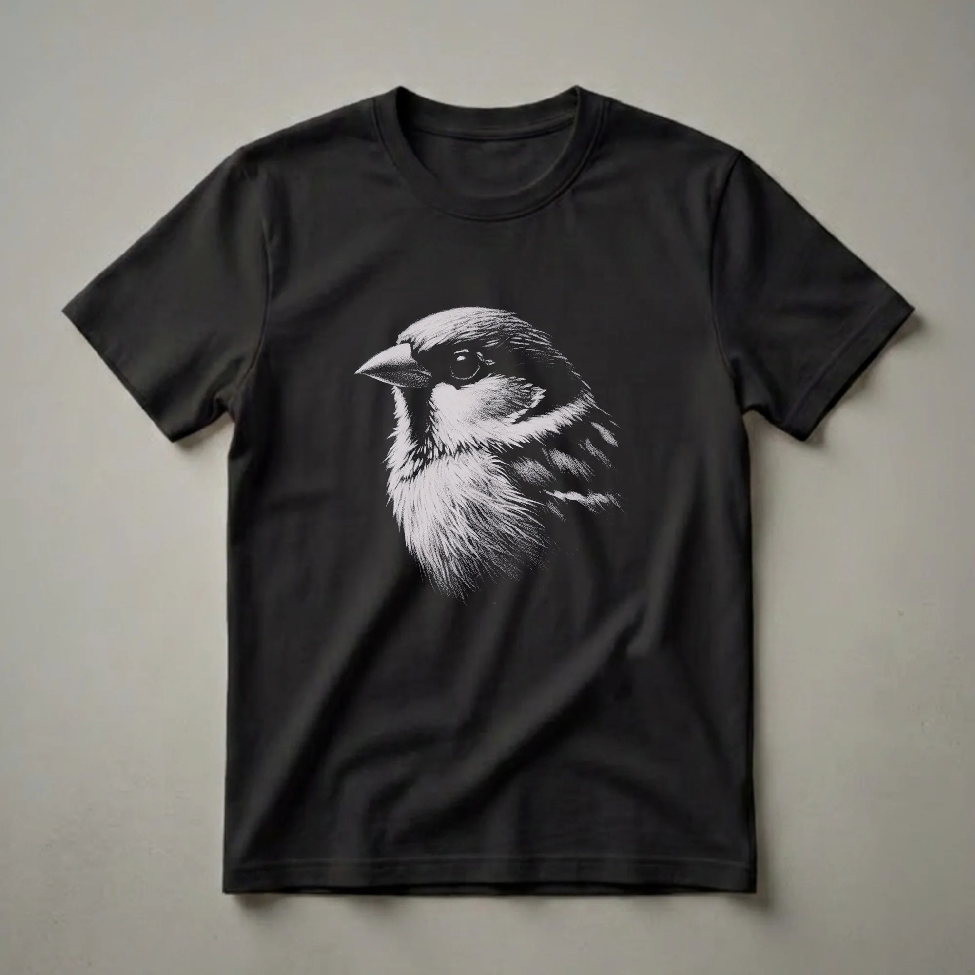Bird watchers and wildlife enthusiasts will appreciate the intricate detail of this sparrow drawing t-shirt. The artwork features a close-up, stippled illustration of a sparrow's head, rendered in shades of white and grey against a stark black background. The fine lines and dots create a realistic texture, highlighting the bird's feathers, keen eye, and sharp beak. Sparrows are among the most common and widespread birds globally, often found in urban and rural environments across continents. Their adaptability allows them to thrive near human settlements, making them a familiar sight for many. This tee is a wonderful way for any bird lover to express their passion for these ubiquitous yet fascinating creatures. It makes a thoughtful gift for anyone who enjoys observing nature or appreciates detailed wildlife art. Wear this shirt on your next nature walk, to a birdwatching event, or simply as a conversation starter about your favorite feathered friends. This graphic tee is a staple for any nature-inspired wardrobe.