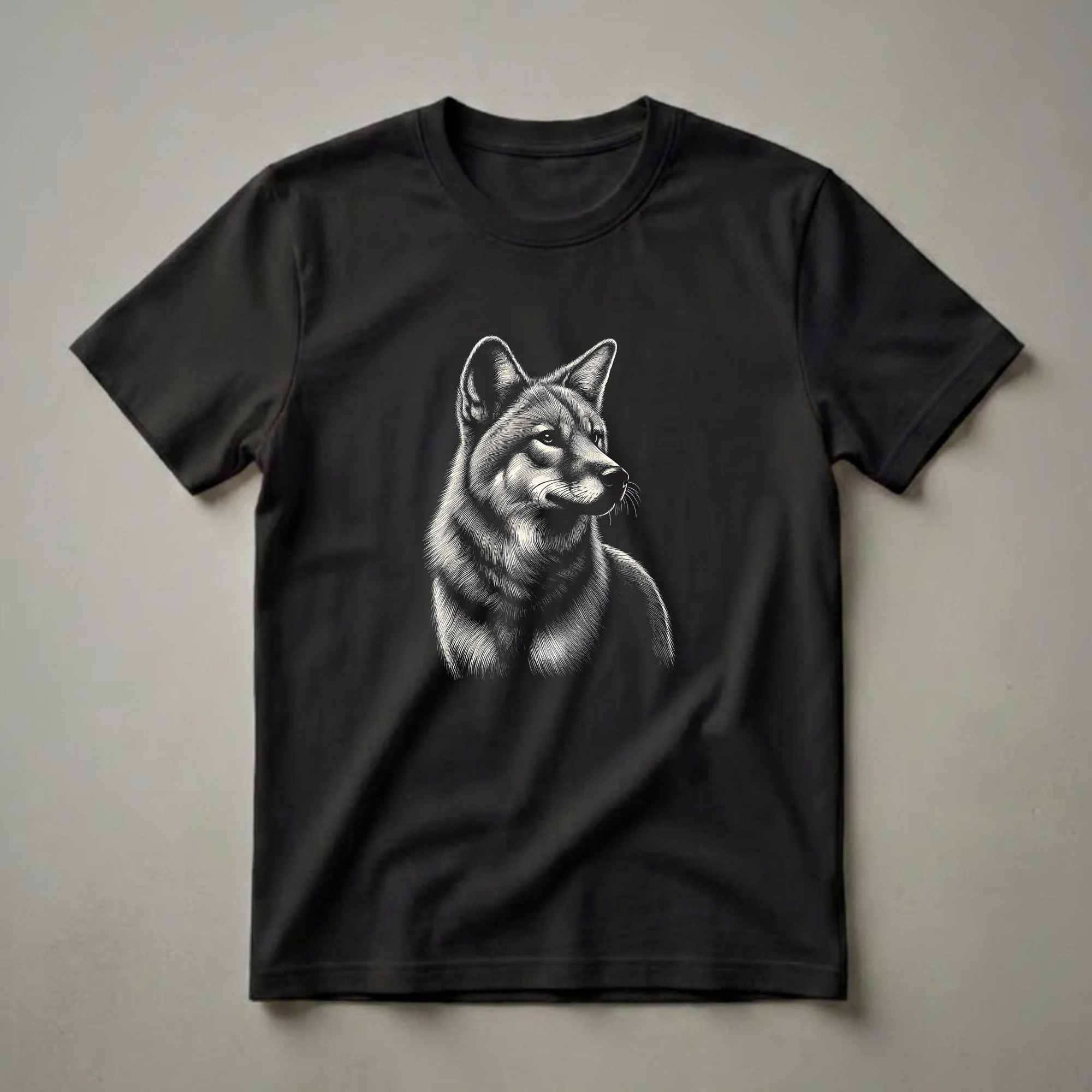 Dingo owners and admirers will appreciate the intricate detail of this graphic art t-shirt. The design features a dingo rendered in a scratchboard style, with fine lines creating a textured and realistic portrayal of its fur, alert ears, and keen eyes. This striking depiction captures the essence of the dingo, a wild canid native to Australia, known for its adaptability and presence in various ecosystems, from grasslands to forests. Dingos are often misunderstood, but their role in the Australian environment is significant, acting as apex predators. This tee is a fantastic way for anyone who admires these unique animals to express their passion. It makes a thoughtful gift for the dog mom or dad who appreciates wild canids, or for someone celebrating a birthday who has a fascination with Australian wildlife. Wear this shirt to your next nature walk or casual outing to spark conversations about these fascinating creatures. This shirt is a staple in the collection for any admirer.