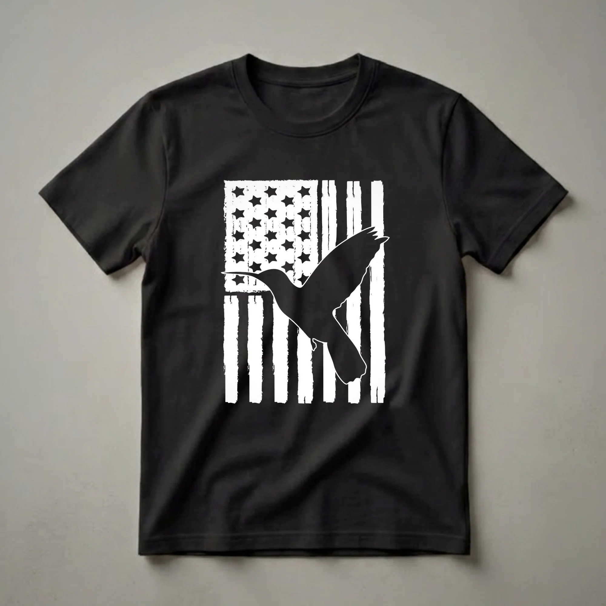 Bird enthusiasts and patriots will appreciate this striking t-shirt design that merges two beloved symbols: the American flag and the hummingbird. The graphic features a distressed rendition of the Stars and Stripes, with bold white stripes and a field of black stars against a white background. A delicate hummingbird silhouette is artfully integrated into the design, appearing to hover near the flag's elements. This shirt is a wonderful way for bird moms and dads to express their passion for these tiny, vibrant creatures. Hummingbirds are known for their incredible agility and speed, often seen flitting from flower to flower. This tee works well for anyone who enjoys birdwatching, nature, or simply appreciates unique, patriotic apparel. It makes a thoughtful gift for friends and family who adore birds or have a strong sense of national pride. Wear this shirt to casual outings, birdwatching trips, or any occasion where you want to showcase your interests. This graphic tee is a staple for any nature lover's wardrobe.