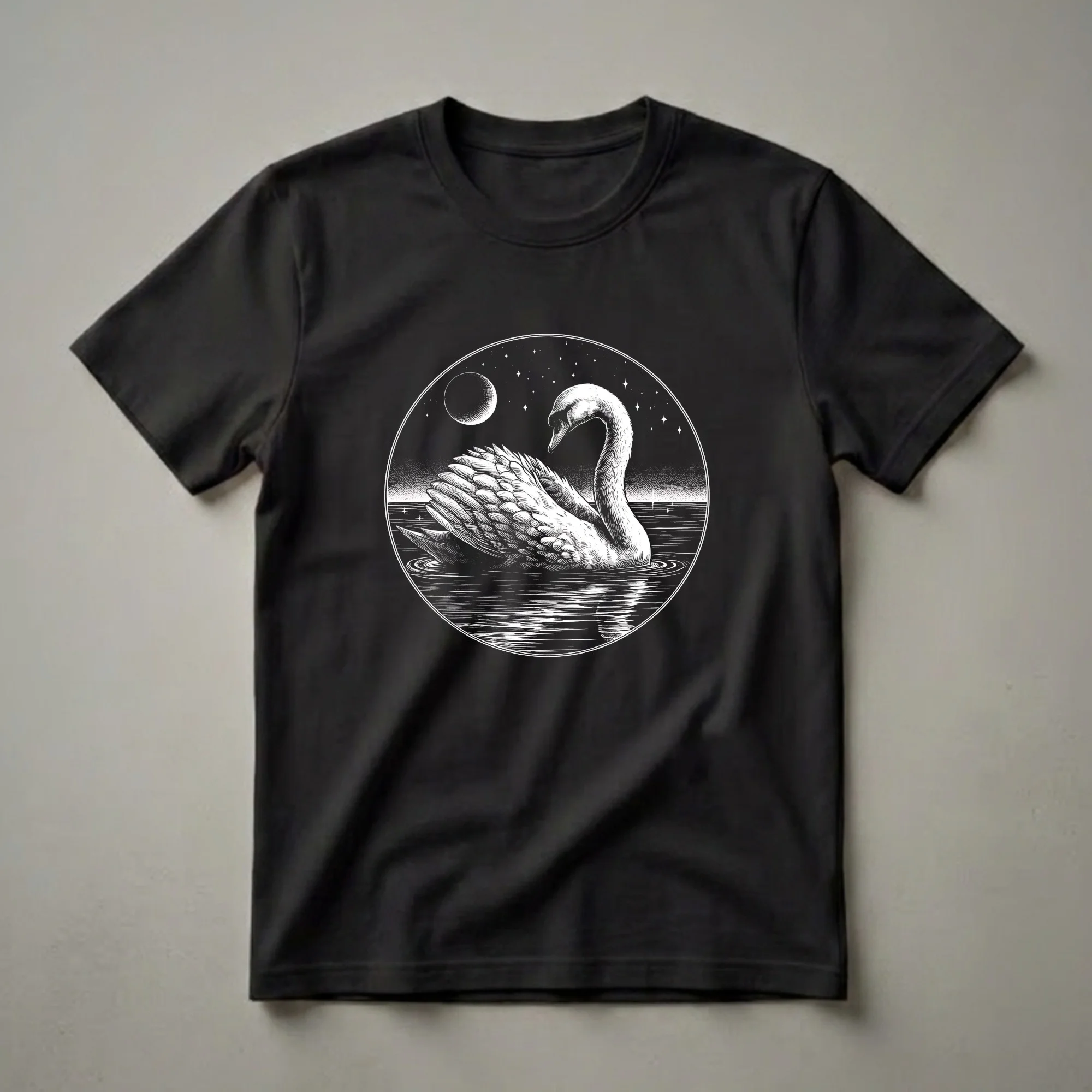 Nature lovers and wildlife enthusiasts will appreciate the detailed artistry of this vintage swan graphic tee. The design features a majestic swan gracefully gliding on calm water, set against a backdrop of a crescent moon and a sky filled with twinkling stars. This illustration style, reminiscent of classic engravings, brings a timeless elegance to the apparel. Swans, known for their grace and beauty, are often symbols of purity and transformation. They are large water birds with long, curved necks, typically found in freshwater habitats across North America, Europe, and Asia. This t-shirt is a wonderful way for birdwatchers or anyone who admires these magnificent creatures to express their passion. It makes a thoughtful gift for someone who enjoys the tranquility of nature or appreciates unique, artistic designs. Wear this shirt to your next nature walk, birdwatching excursion, or casual outing to spark conversations about the natural world. This tee is a go-to for serene outdoor adventures.