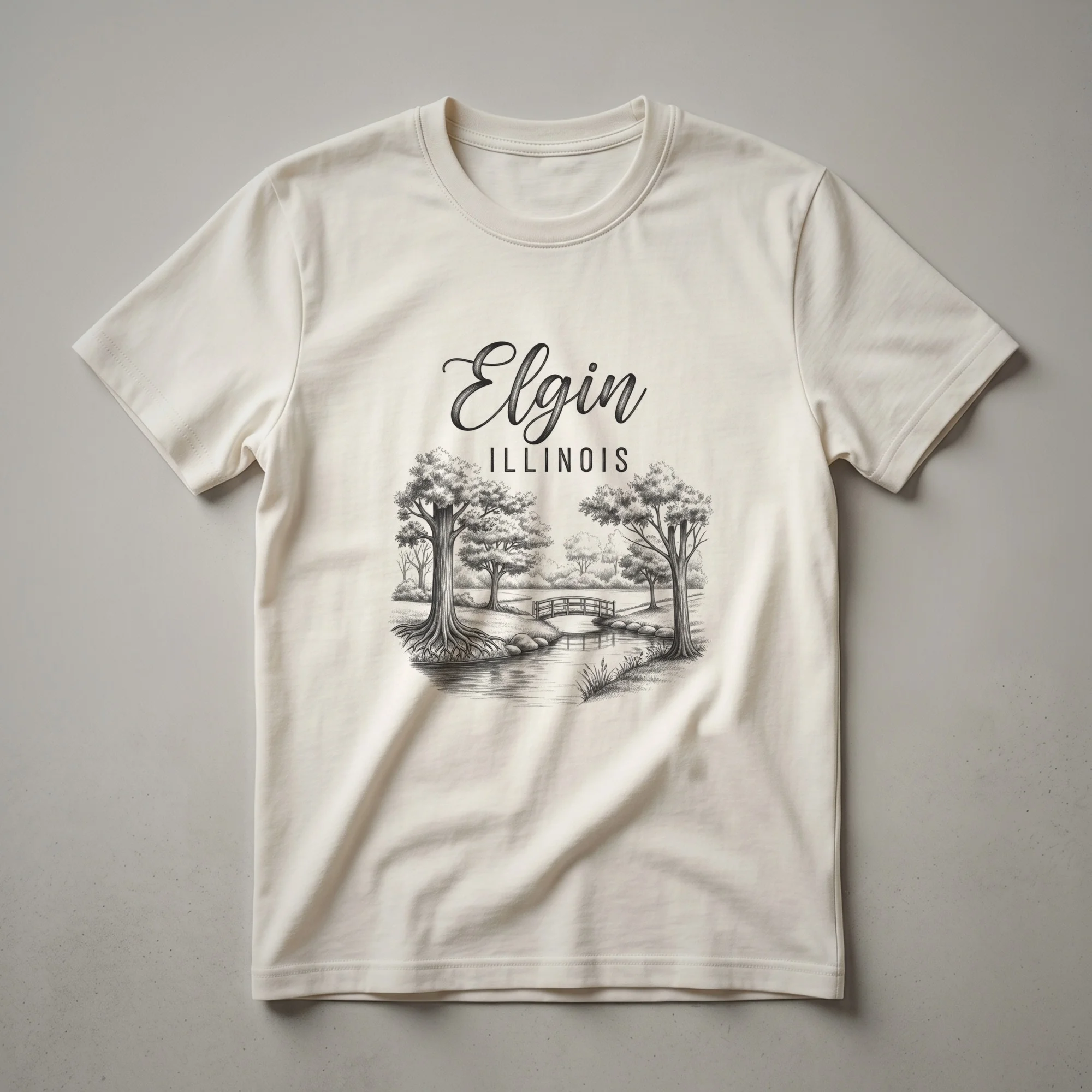 - Graphic t-shirt featuring a sketch of a park scene in Elgin, Illinois.