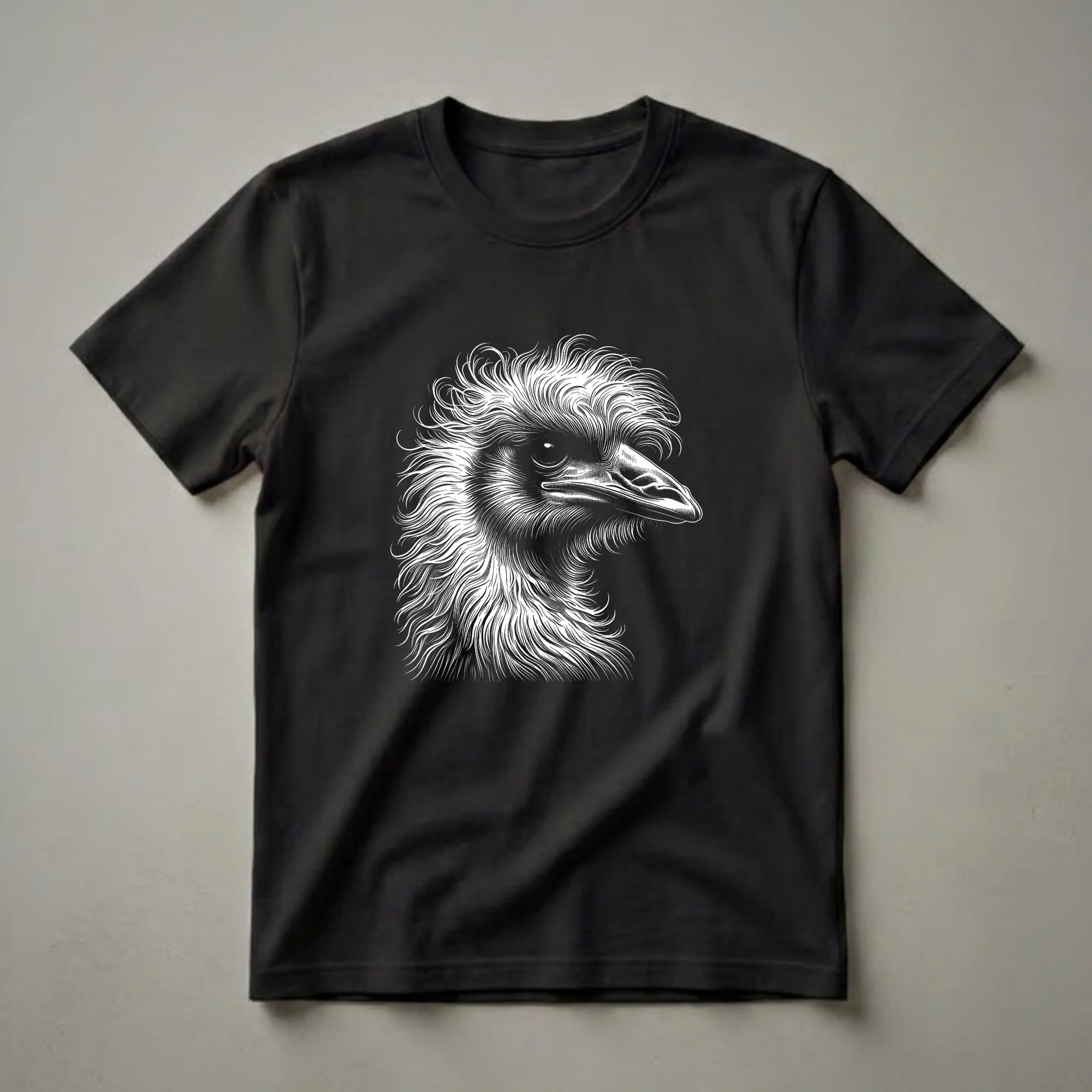 Wildlife enthusiasts will appreciate the intricate detail of this emu graphic art t-shirt. The design features a close-up, black and white illustration of an emu's head, rendered with fine lines that capture the texture of its feathers and its distinctive beak. Emus, native to Australia, are the second-largest living birds by height, known for their powerful legs and ability to run at speeds up to 30 miles per hour. This eye-catching tee is a staple in the collection for anyone who admires these fascinating flightless birds. It makes a thoughtful gift for bird watchers, nature lovers, or those who simply appreciate unique animal art. Wear this shirt on your next nature walk or to a casual gathering to spark conversations about the wonders of the natural world. This graphic tee is a great way to express your passion for avian life and the wild.