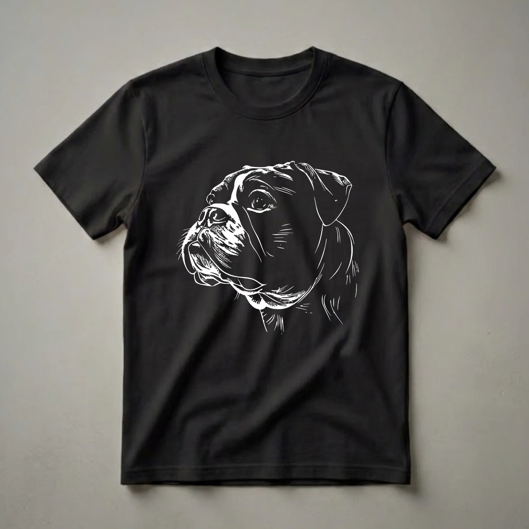 English Bulldog lovers who want to wear their affection on their sleeve will adore this graphic tee. The design features a detailed white line art illustration of an English Bulldog's face, depicted in profile, looking to the left. The art style captures the breed's characteristic wrinkled face, jowls, and expressive eyes with bold, clean lines against a stark black background. English Bulldogs, known for their muscular build and gentle disposition, originated in England and were initially bred for bull-baiting. Despite their tough appearance, they are renowned for being affectionate and loyal companions. This shirt is a thoughtful gift for any English Bulldog mom or dad who cherishes their unique pet. It's a go-to in the collection for anyone who appreciates canine art and wants to express their passion for this beloved breed. Wear this eye-catching t-shirt to your next dog park visit or casual outing to spark conversations with fellow dog enthusiasts.