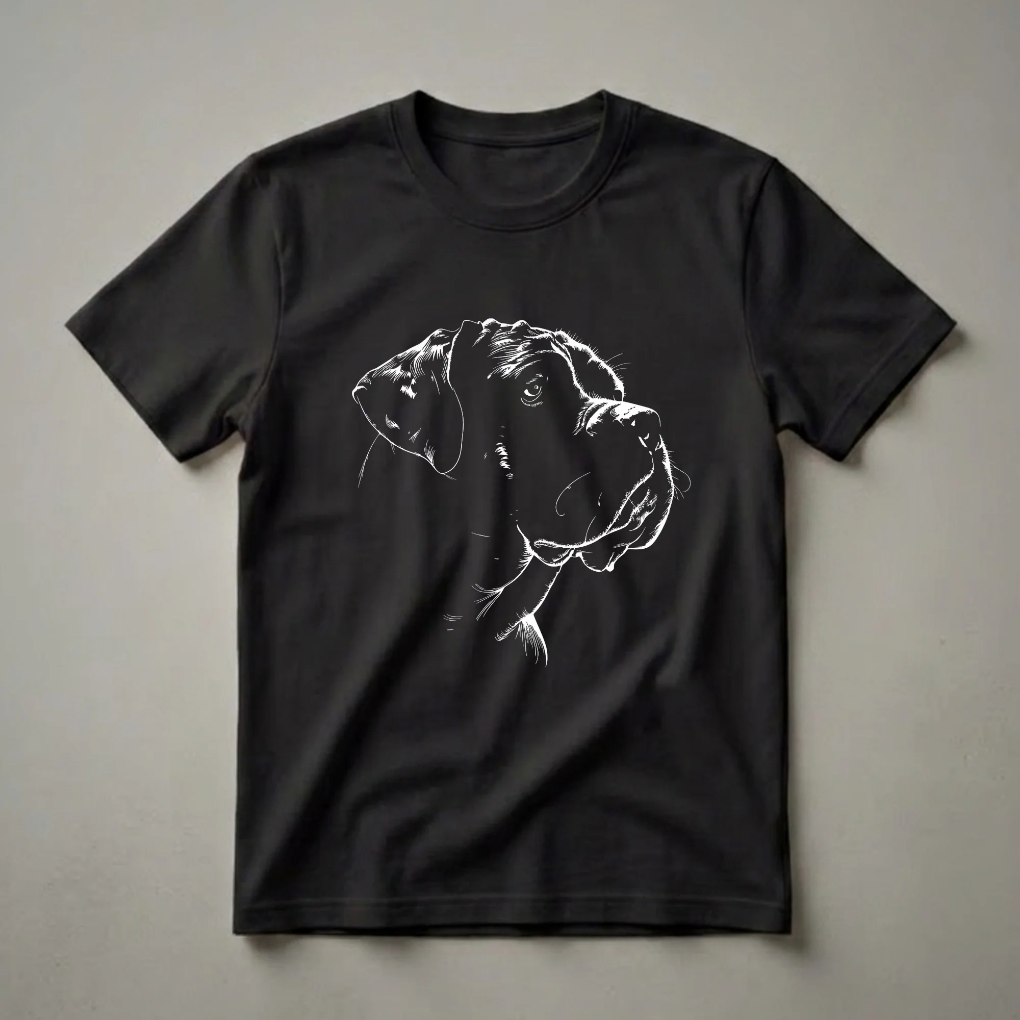 English Mastiff owners know the breed's gentle nature and imposing presence. This striking graphic tee features a detailed white line art sketch of an English Mastiff's face, capturing the breed's distinctive features with elegant simplicity against a solid black background. The artwork highlights the jowls, expressive eyes, and the noble profile of this magnificent dog. English Mastiffs, originating from ancient mastiff-type dogs, were historically used as guard dogs and war dogs, but today are cherished for their calm and affectionate temperament. This t-shirt is a thoughtful gift for any English Mastiff mom or dad who wants to wear their affection for their loyal companion. It's a go-to tee for casual outings, dog park visits, or simply relaxing at home with your furry friend. Celebrate the bond you share with this eye-catching English Mastiff shirt, a staple for any dog lover's wardrobe.