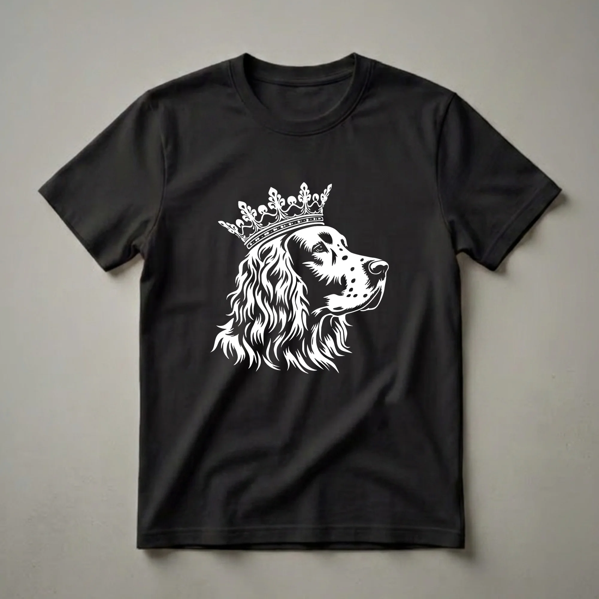 English Setter owners who appreciate the breed's elegant appearance and gentle nature will reach for this unique graphic tee. The design features a striking white silhouette of an English Setter's head, complete with its signature long, flowing ears and expressive eyes, all adorned with an ornate, detailed crown. This regal depiction captures the noble spirit of the breed, often referred to as the "gentleman" of the dog world. English Setters, originating from England, were historically bred for hunting game birds, known for their stamina and keen sense of smell. This shirt is a thoughtful gift for any dog mom or dog dad who considers their English Setter a true member of the family, perhaps even their furry royalty. Wear this eye-catching t-shirt to your next dog park visit or casual outing to spark conversations with fellow breed enthusiasts. It's a staple in the collection for anyone who cherishes their canine companion.