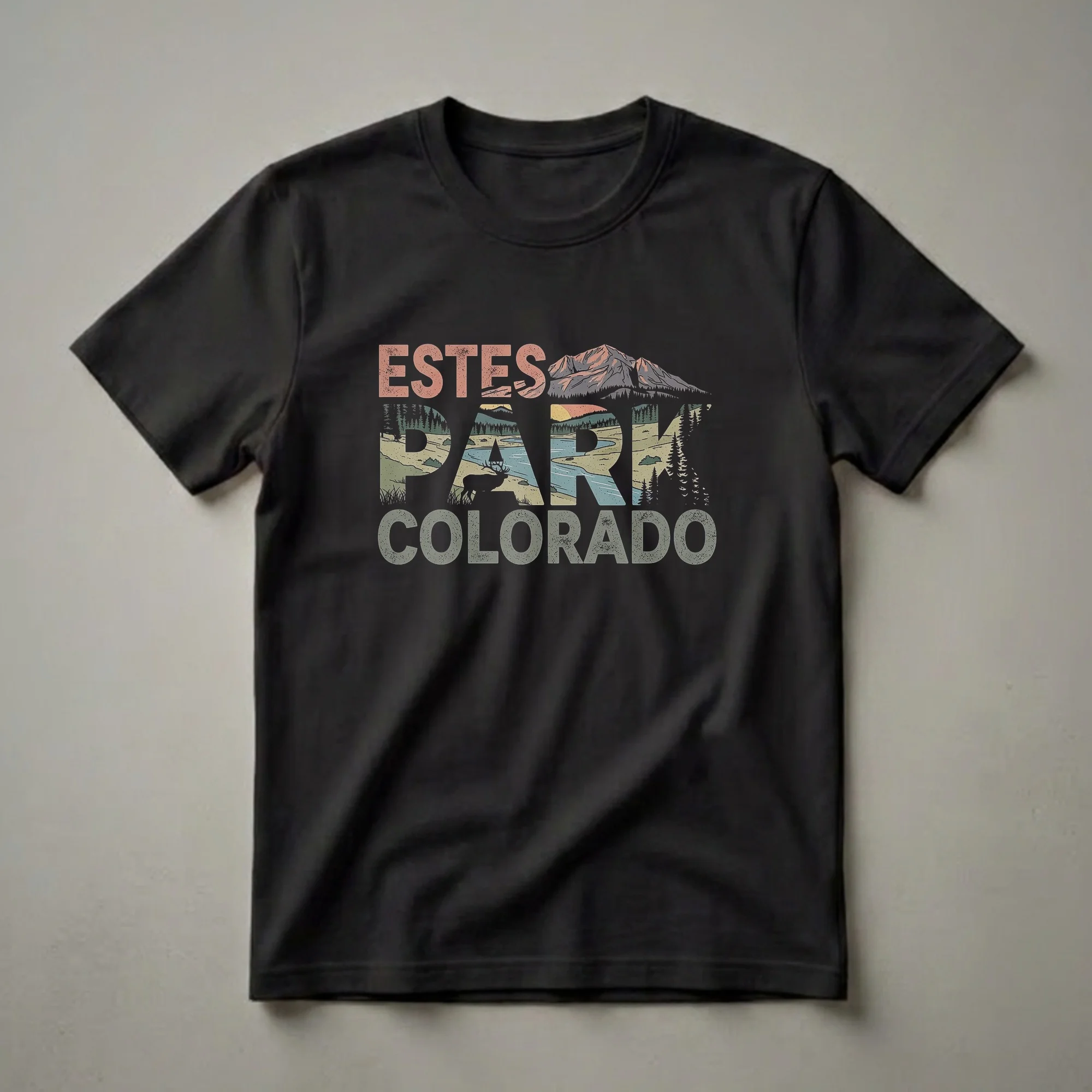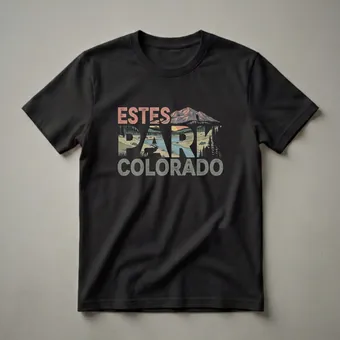 Estes Park sits at 7,522 feet at the eastern gateway to Rocky Mountain National Park in Colorado, serving as the base camp for one of the most visited national parks in the United States. The town is famous for its resident elk herd, a population of over 600 Rocky Mountain elk that move through town seasonally, rutting on golf courses and main street in September and October. Rocky Mountain National Park encompasses 415 miles of trails and the Trail Ridge Road, which crests at 12,183 feet, the highest continuously paved road in the United States. This retro graphic tee captures Estes Park's mountain identity with bold stacked lettering in rust, olive, and gold, an elk silhouette, river valley, and pine forest woven into the design. Wear this shirt hiking the park, visiting during elk rut season, or on any day the Rockies feel close. A thoughtful gift for Colorado mountain lovers and national park regulars.