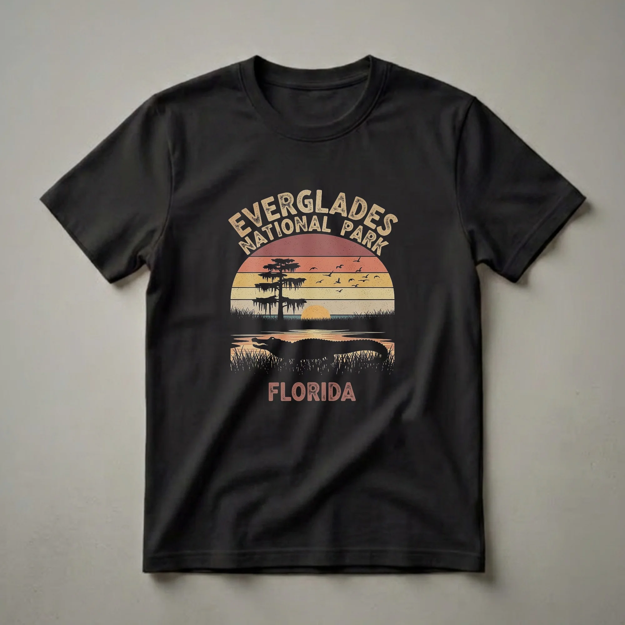 Everglades National Park, a unique subtropical wilderness in Florida, is celebrated on this eye-catching graphic tee. The design captures the essence of the park with a silhouette of an American alligator basking near the water's edge, surrounded by tall marsh grasses. Above, a lone cypress tree, draped with Spanish moss, stands against a vibrant, retro-style sunset with horizontal stripes of orange, yellow, and red. A flock of birds soars across the sky, adding to the serene yet wild atmosphere. The text 'Everglades National Park' arches over the scene, with 'Florida' prominently displayed below. This t-shirt is a thoughtful gift for hikers, campers, and anyone who cherishes the diverse ecosystems and wildlife found in this remarkable national park. It's a great way to remember a trip or express pride in visiting this iconic Florida destination. Wear this shirt to your next outdoor adventure or casual outing to showcase your appreciation for nature.