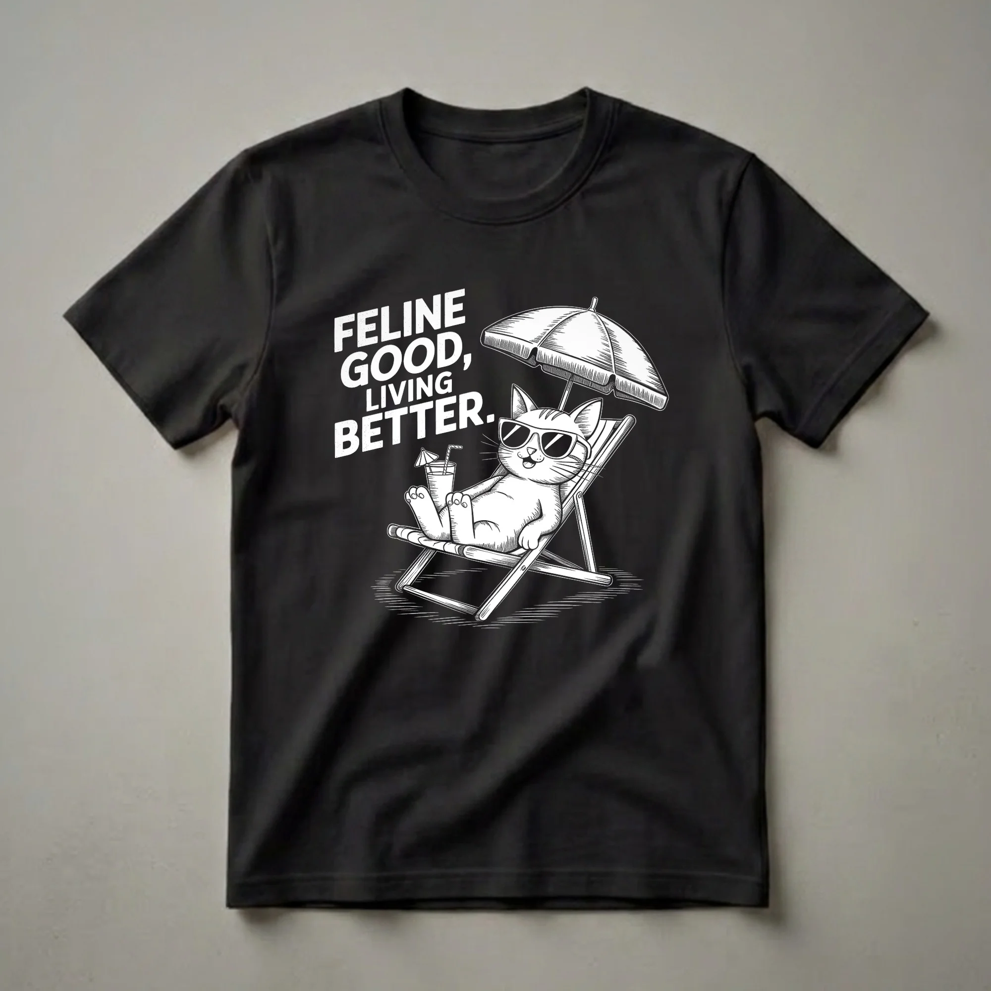 Cat moms and dads who appreciate a good pun will reach for this "Feline Good, Living Better" graphic tee. The design features a whimsical, retro-style illustration of a cat lounging in a deck chair under a striped umbrella, complete with sunglasses and a tropical drink. This eye-catching t-shirt captures the essence of relaxation and good vibes, making it a staple in any cat enthusiast's wardrobe. Cats, known for their independent spirit and ability to find the most comfortable spots, inspire this laid-back imagery. This shirt works well for casual outings, game nights, or simply lounging at home. It makes a thoughtful gift for the cat lover in your life who enjoys a bit of humor and a carefree attitude. Imagine gifting this to your best friend who always says they wish they were a cat, always napping in the sun. This tee is a fun way to express your love for felines and your appreciation for a slower pace of life. It’s a conversation starter and a comfortable addition to any casual outfit, a thoughtful choice for anyone who believes that life is better with a cat by their side.
