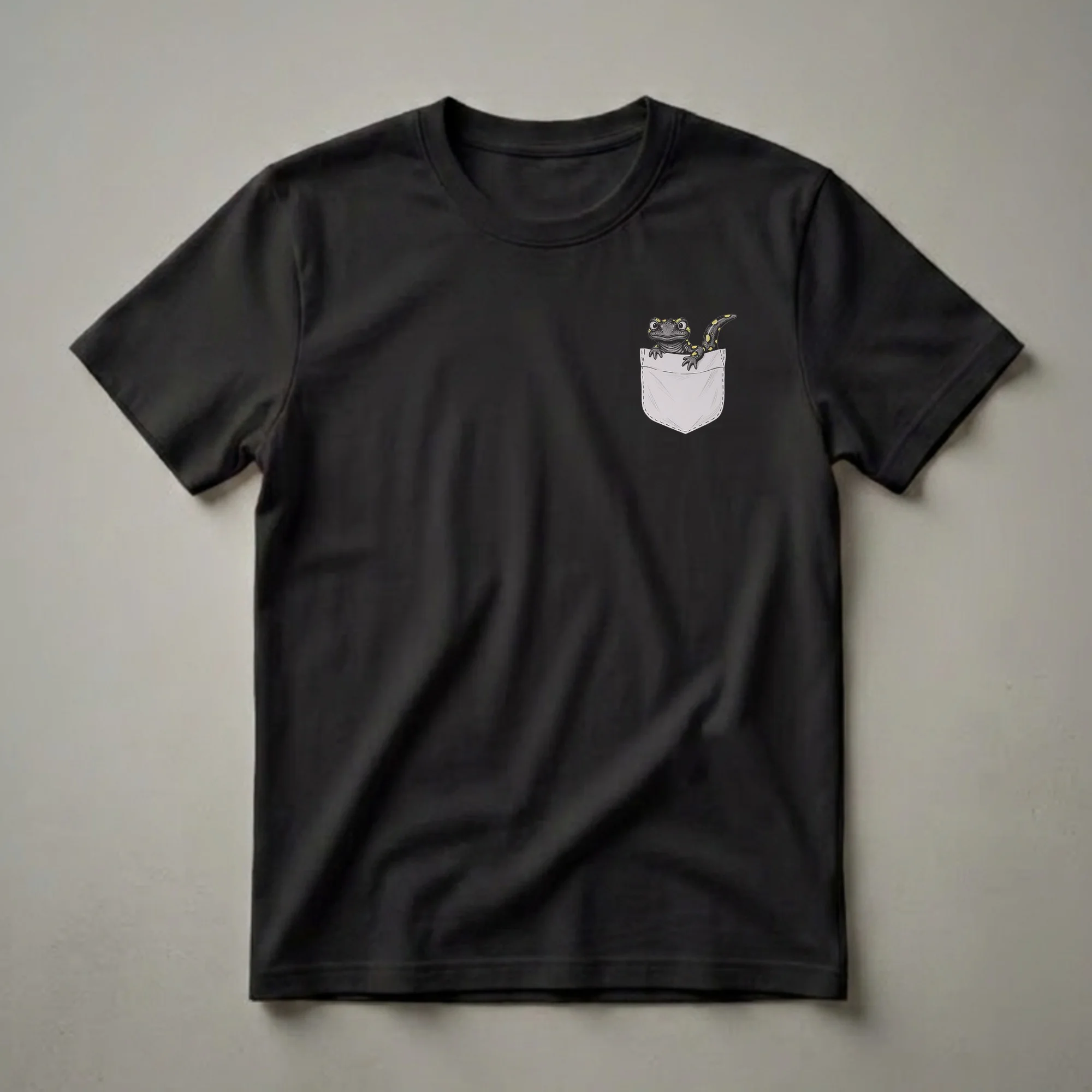 Reptile enthusiasts will appreciate this eye-catching graphic tee featuring a detailed drawing of a fire salamander peeking out from a stylized pocket. The fire salamander, known for its striking black and yellow markings, is a fascinating amphibian found in parts of Europe. These creatures typically inhabit damp woodlands, preferring areas near streams and under logs or rocks. This unique t-shirt design captures the curious nature of the salamander, making it a standout piece for any wildlife admirer. It's a comfortable and stylish shirt that sparks conversation, whether you're out hiking or just relaxing at home. This tee makes a thoughtful gift for the herpetologist or nature lover in your life who enjoys unique animal art. Wear this shirt to express your fascination with these incredible amphibians and their natural habitats.