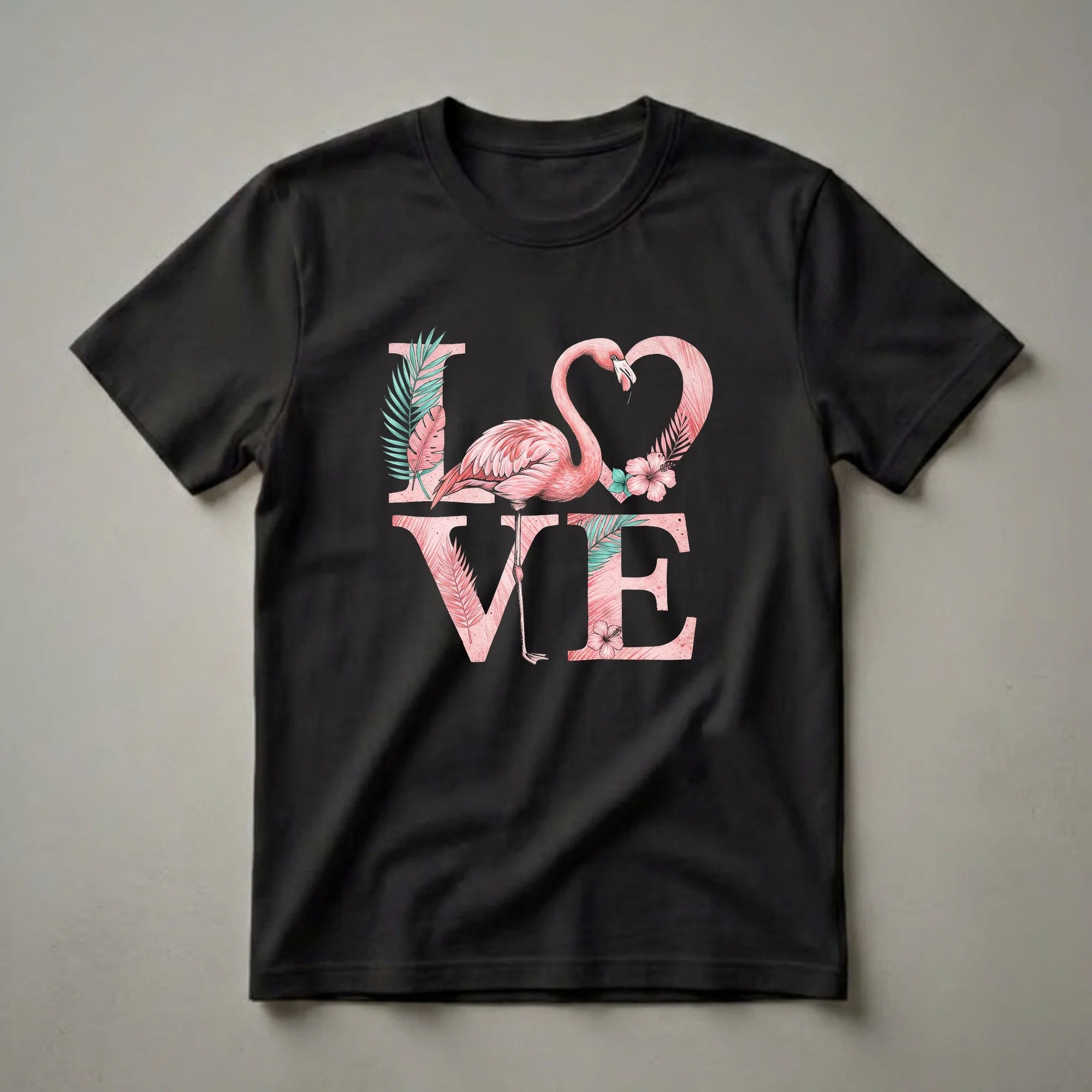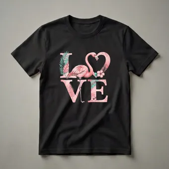- Pink flamingo forms the letter O in LOVE with its heart-shaped neck curve on a black shirt.