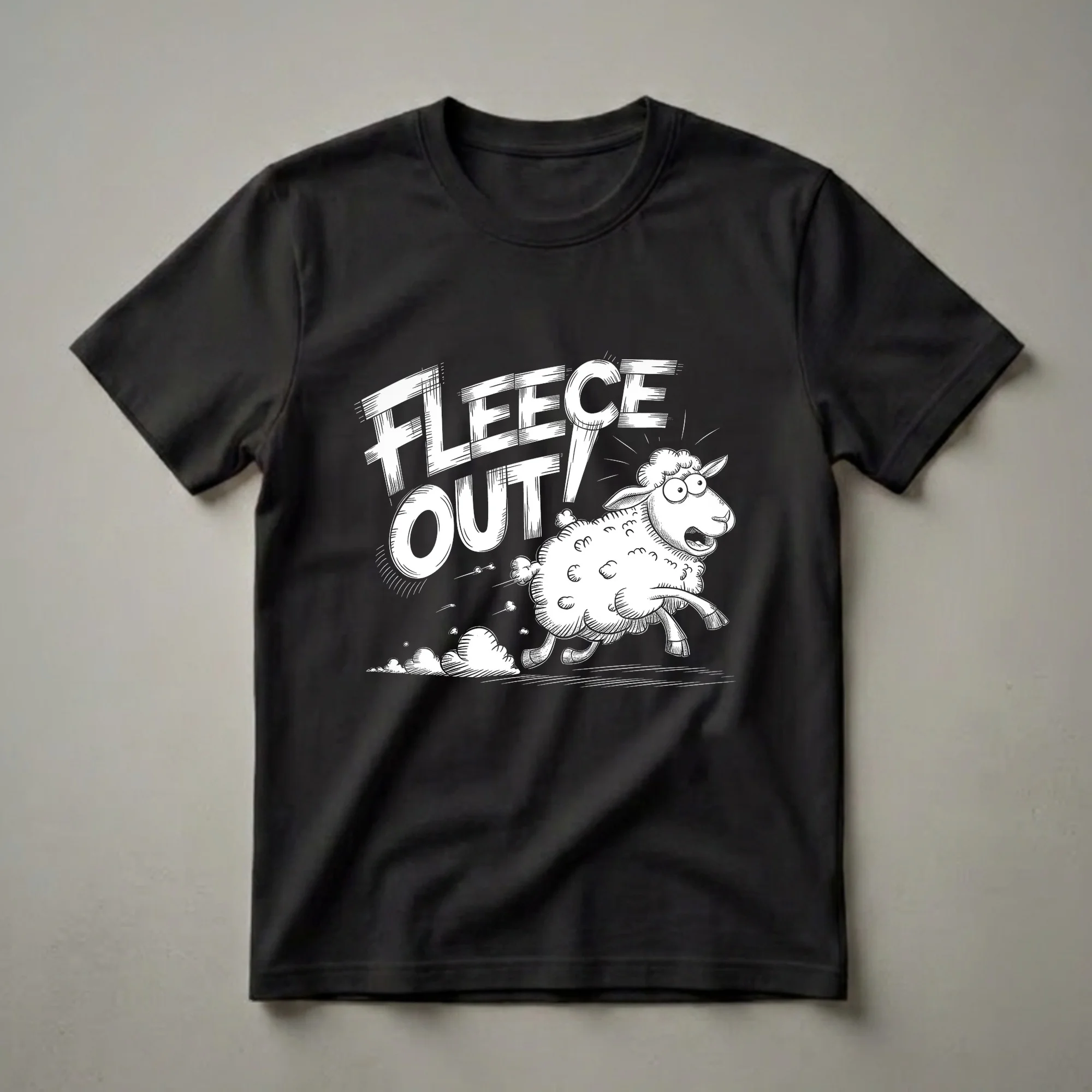 Animal lovers who appreciate a good pun will reach for this humorous sheep t-shirt. The graphic features a cartoon sheep with wide, startled eyes, legs flailing as it runs, kicking up dust clouds. Bold, distressed white lettering above the sheep reads 'FLEECE OUT!', playing on the common phrase and the animal's woolly coat. Sheep, known for their docile nature and their valuable fleece, are often associated with flocks and pastoral scenes. This tee captures a moment of unexpected chaos, making it a conversation starter. It's a thoughtful gift for anyone who enjoys quirky animal humor or has a soft spot for ovine antics. Wear this shirt to your next casual gathering, game night, or just around the house when you want to share a laugh. This graphic tee is a fun way to express your love for animals with a playful twist.
