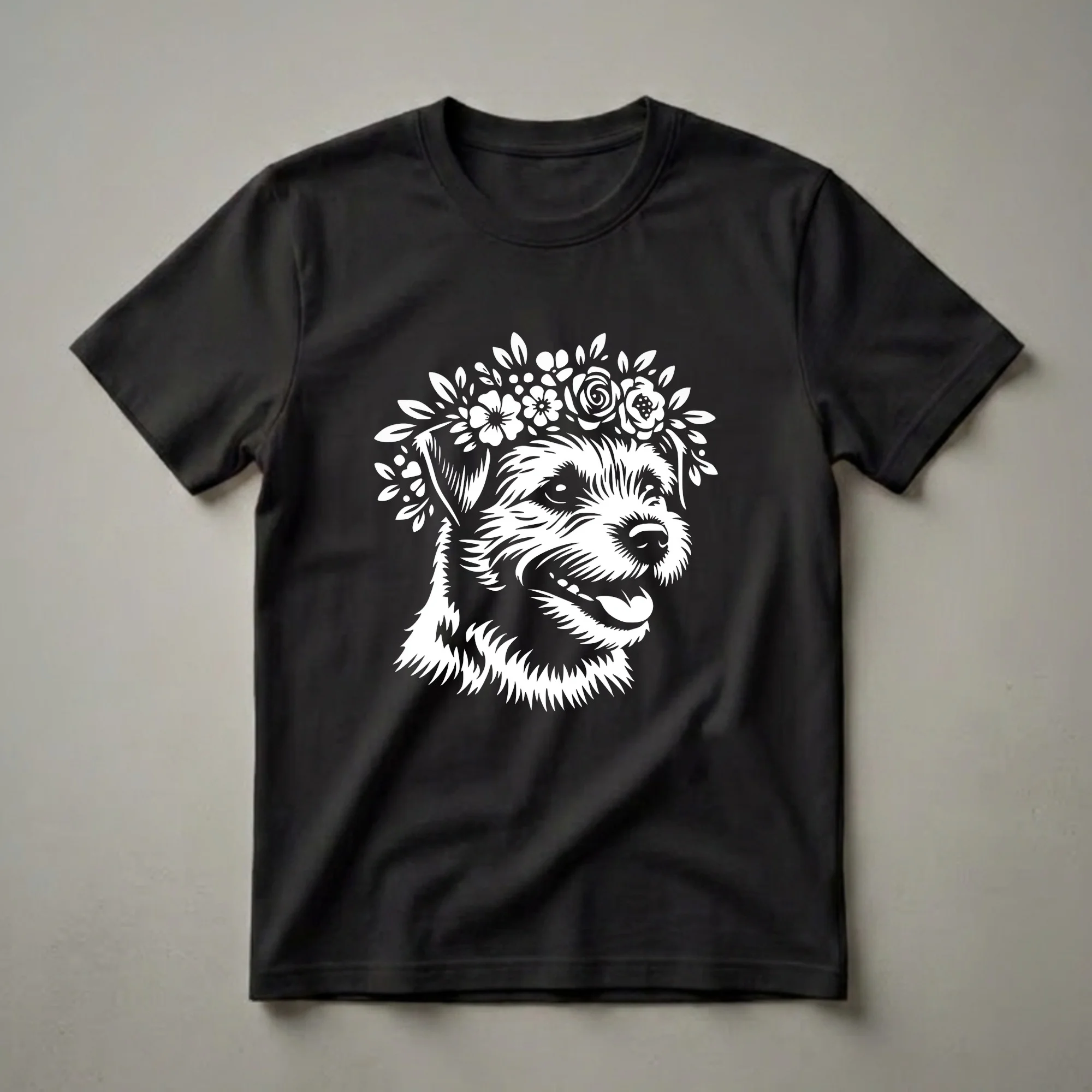 Border Terrier enthusiasts who appreciate unique canine art will reach for this striking graphic tee. The design features a stylized white stencil of a Border Terrier's face, complete with its characteristic wiry fur texture. Adorning the dog's head is a delicate crown of flowers and leaves, adding a touch of natural beauty and charm to the portrait. Border Terriers, originating from the border region between England and Scotland, are known for their hardiness, spirited nature, and affectionate personalities, making them a beloved breed. This shirt is a wonderful way for any proud Border Terrier mom or dad to express their devotion to their four-legged companion. It makes a thoughtful gift for birthdays, holidays, or just because for the dog lover in your life. Wear this eye-catching t-shirt to dog parks, casual outings, or while relaxing at home with your beloved pet. This apparel is a staple in any dog lover's wardrobe.